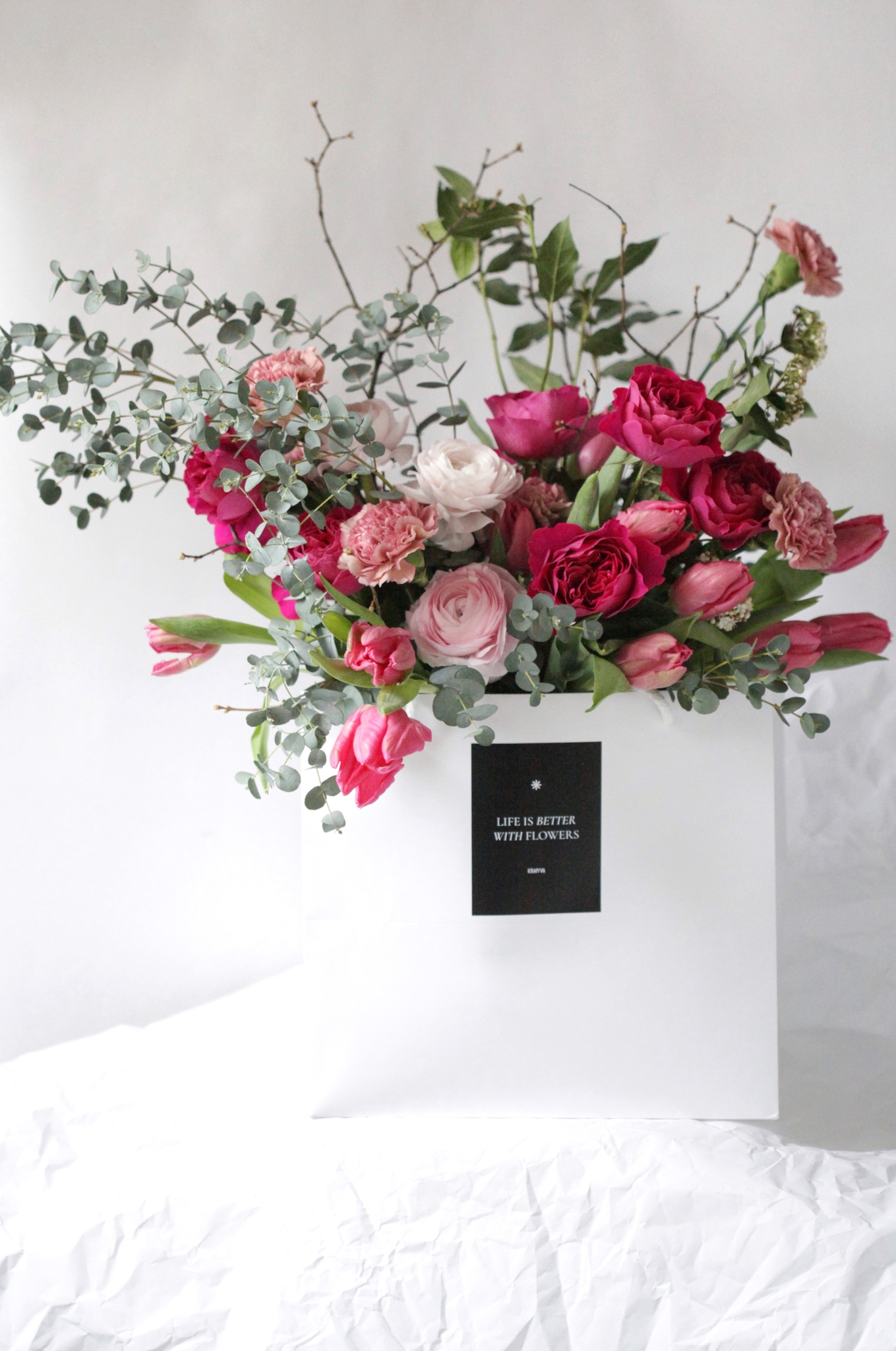 В составе: каллы, анемоны, тюльпаны, скиммия, леукодендрон, эвкалипт, нутан.