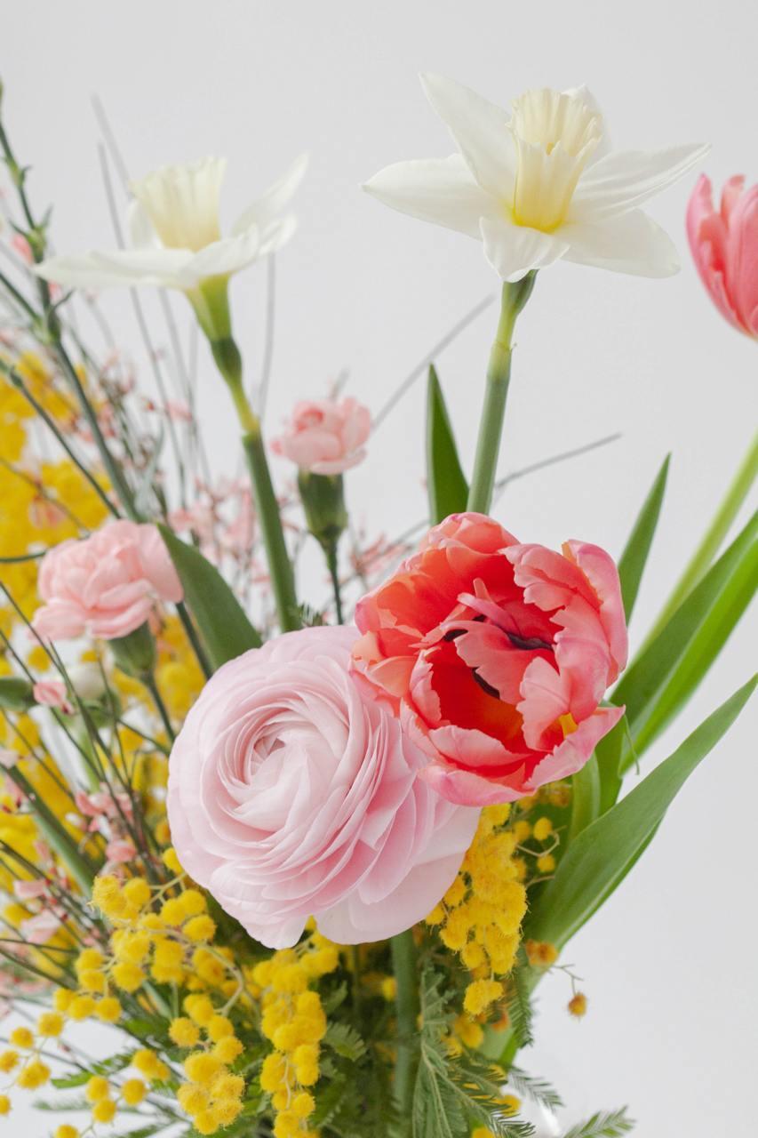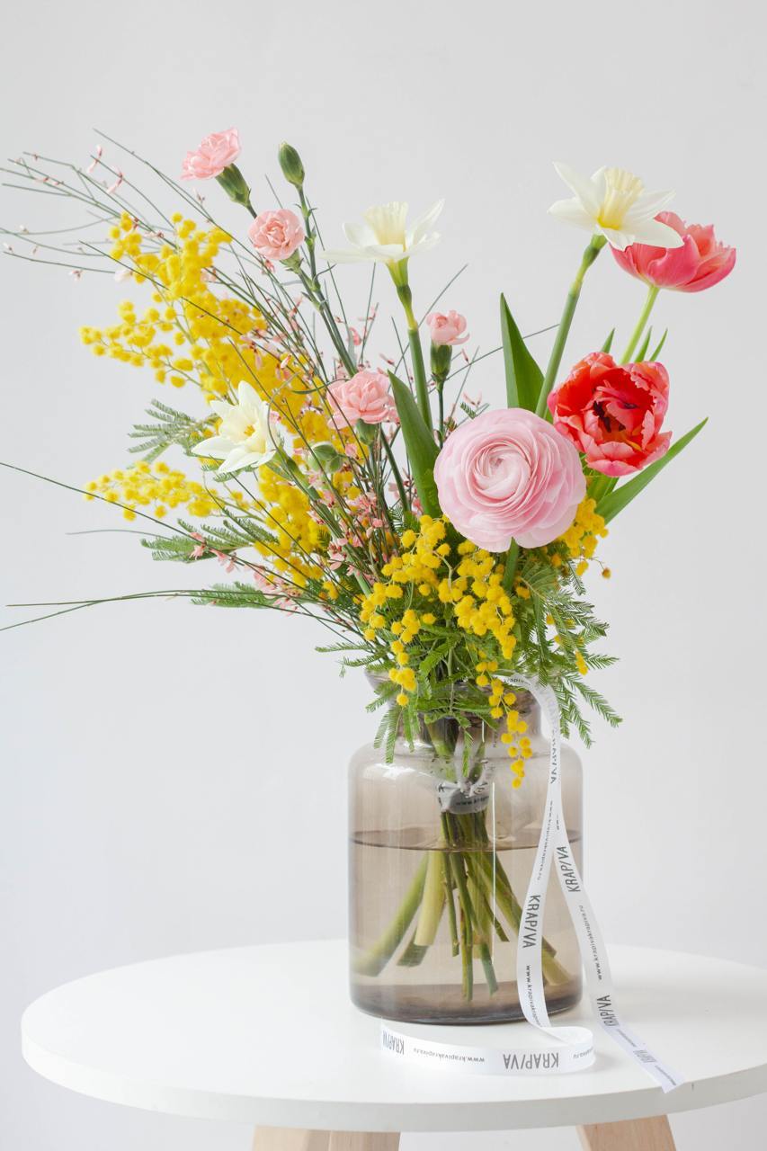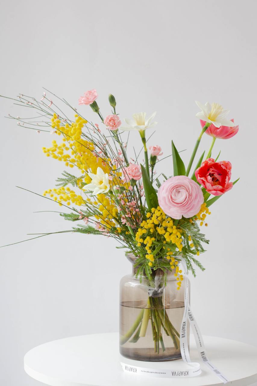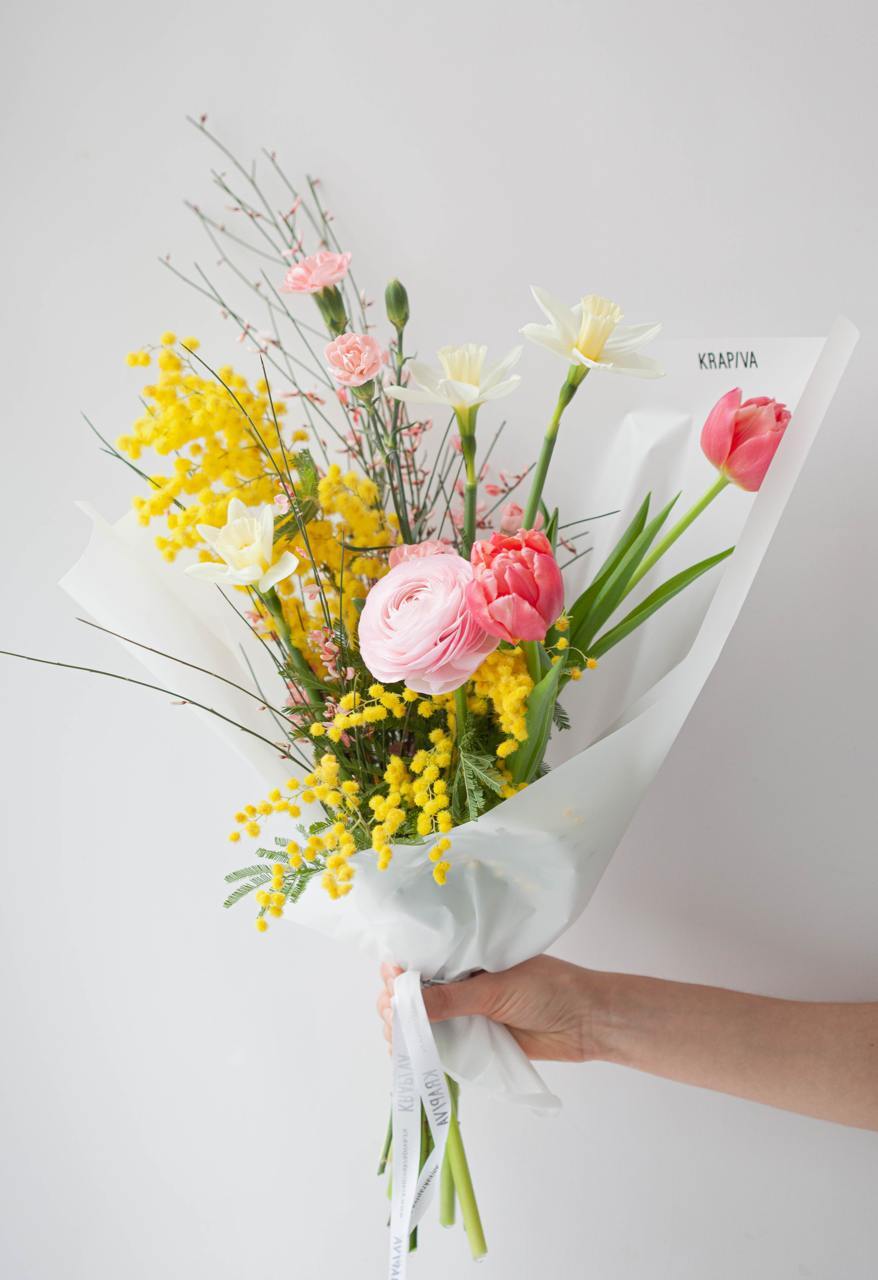 В составе: мимоза, гениста, ранункулюс,тюльпаны, нарциссы, кустовая гвоздика.