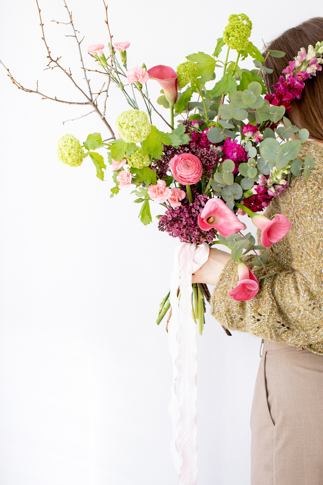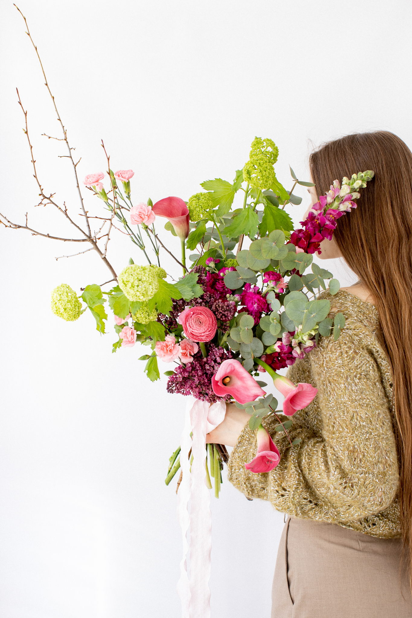 Cостав: ранункулюс, сирень, маттиола кустовая, калла, антирринум, гвоздика кустовая, вибурнум, цветущая ветвь, эвкалипт.