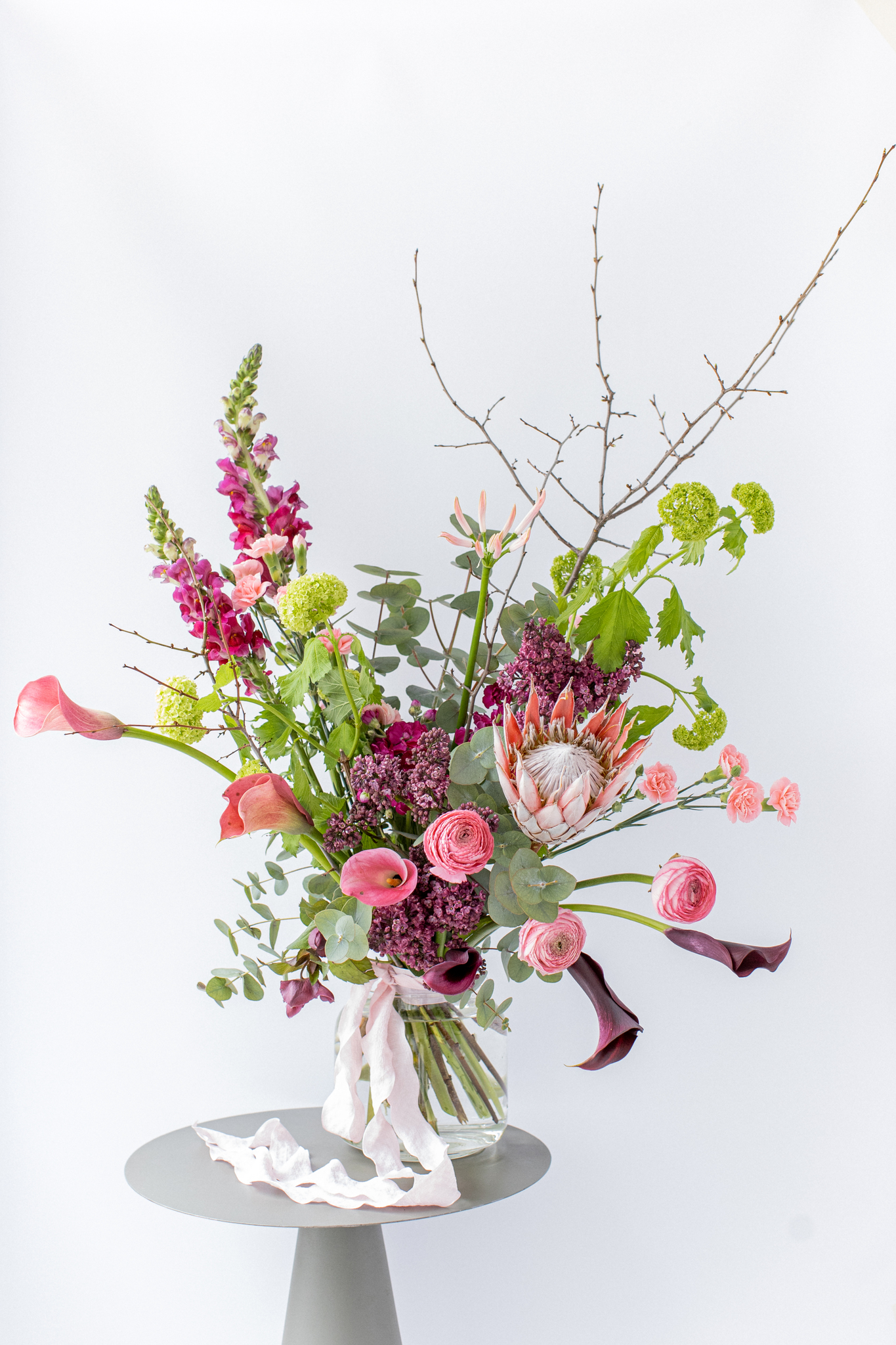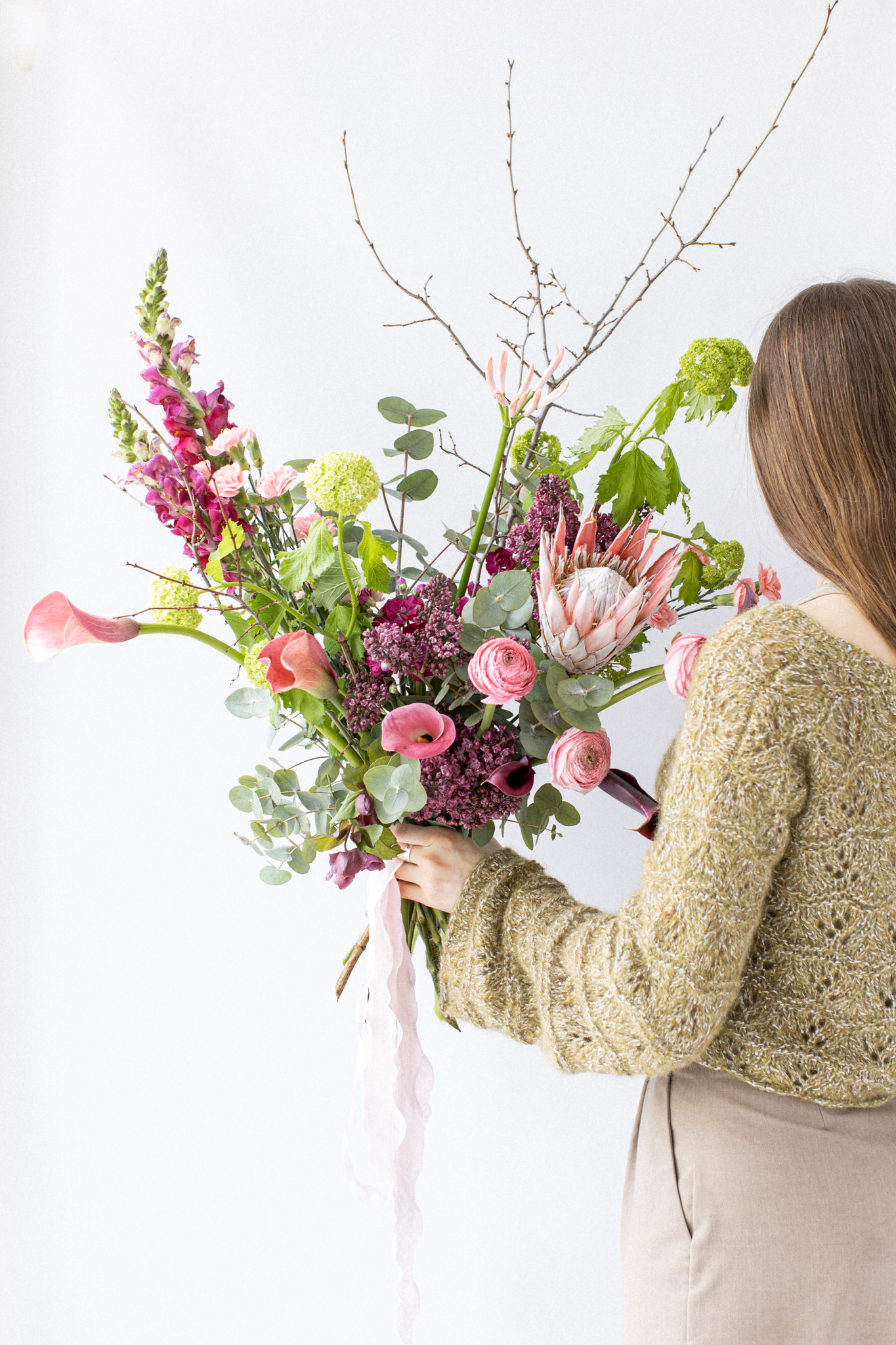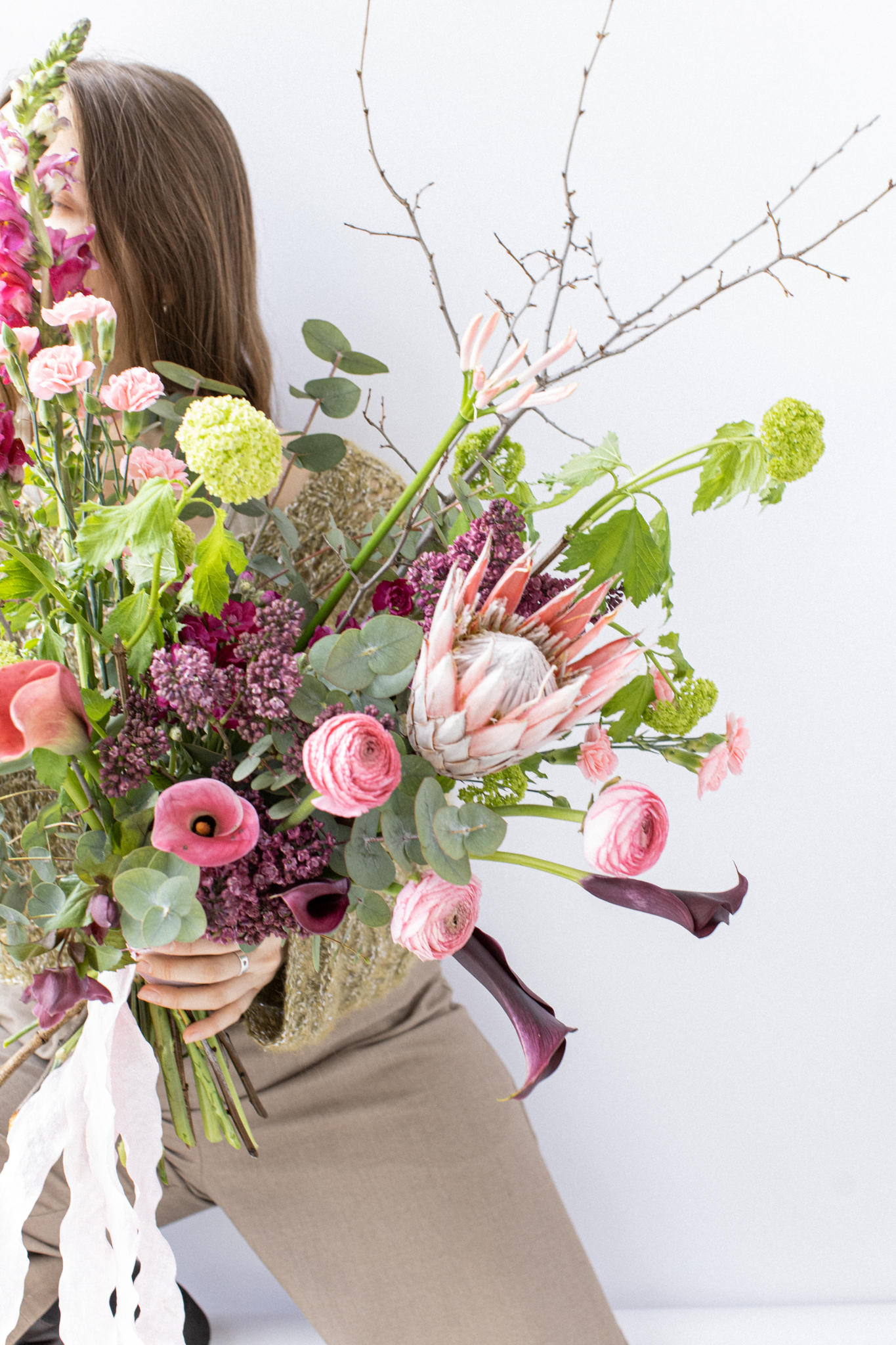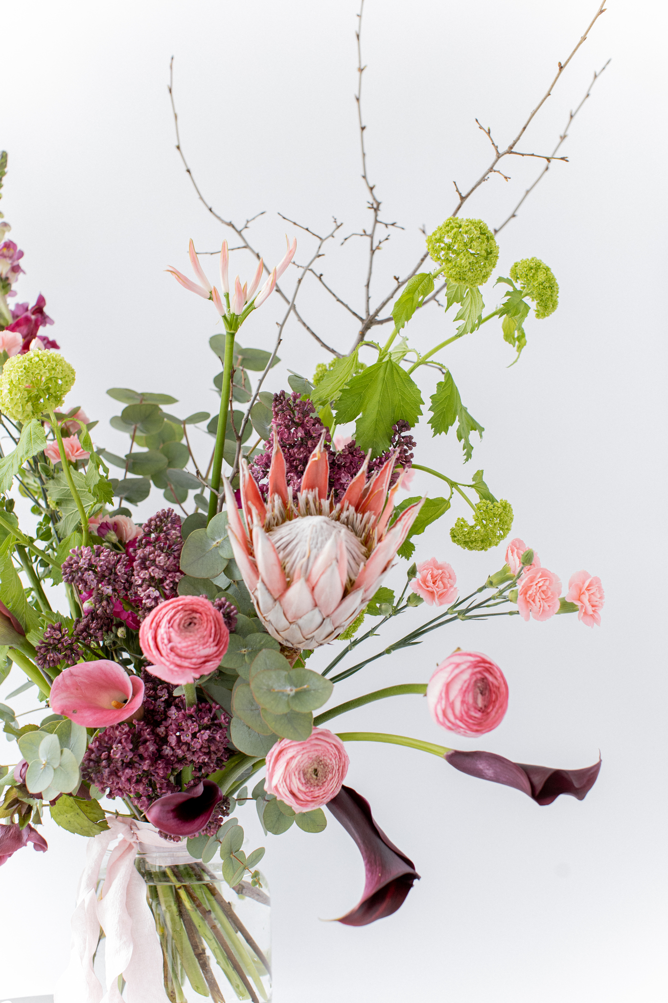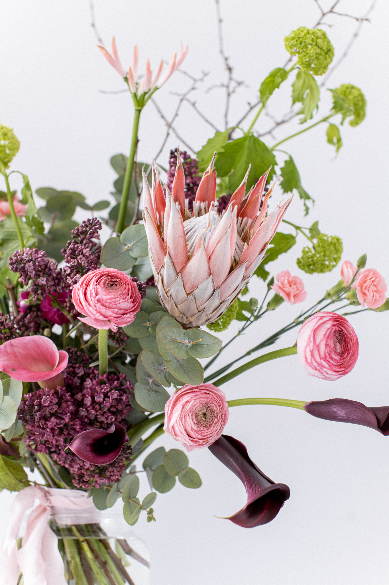 Cостав: королевская протея, ранункулюс, сирень, маттиола кустовая, калла, антирринум, нерине, хелеборус, гвоздика кустовая, вибурнум, цветущая ветвь, эвкалипт.
