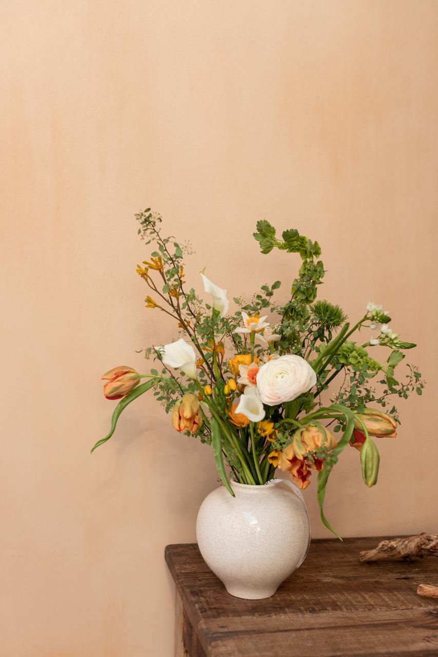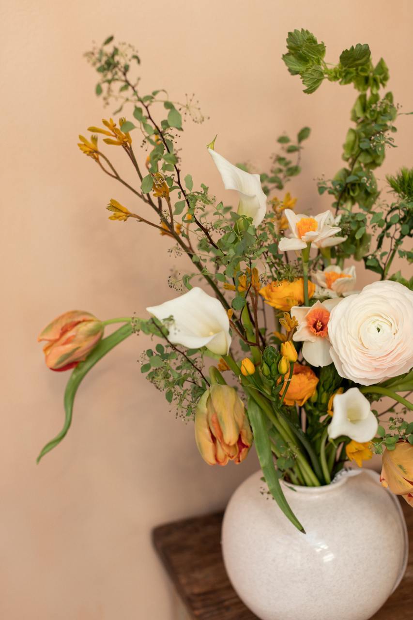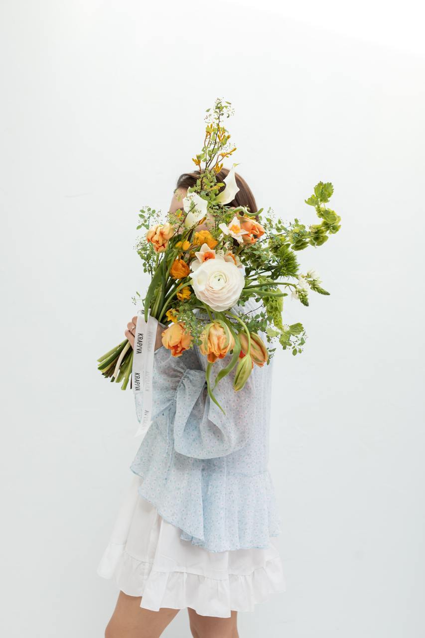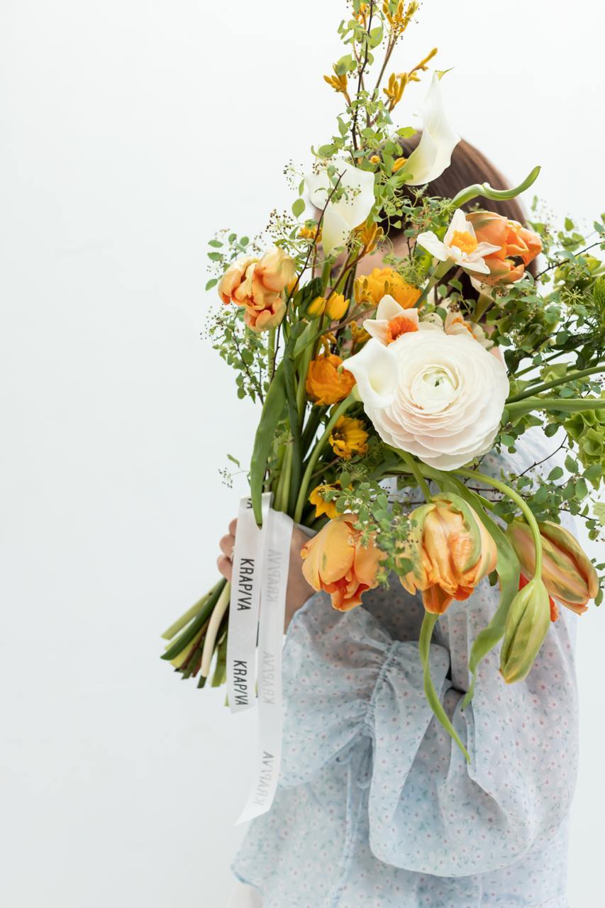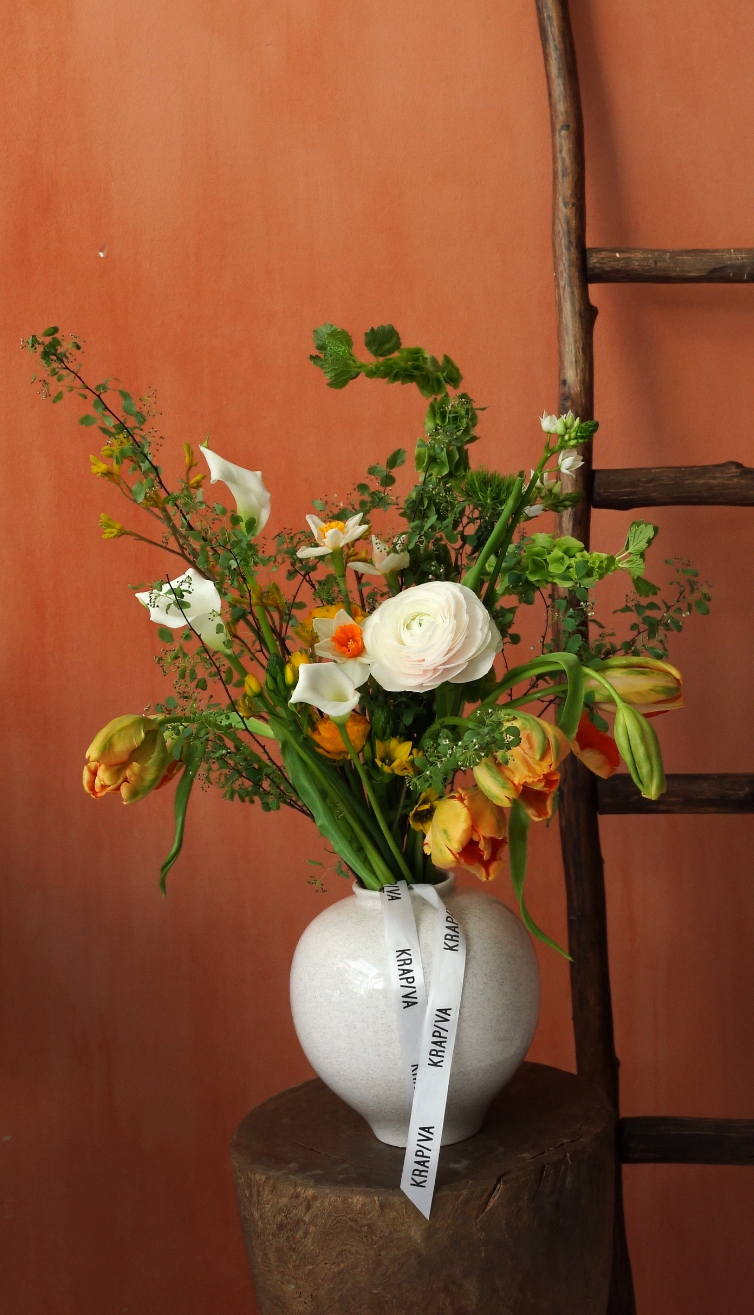 В составе: Французский тюльпан, ранункулюс, нарцисс, калла, гвоздика киви, орнитогалум, анигозантус, молюцелла, ветки спиреи.