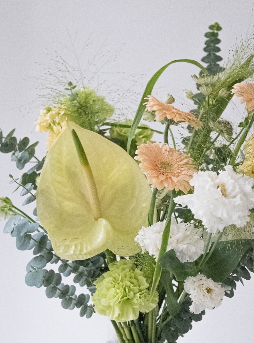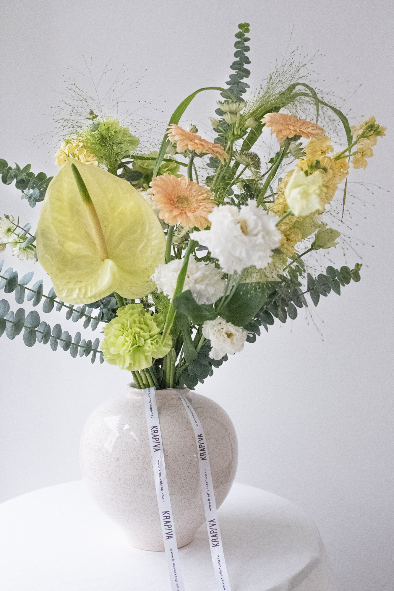 Состав: гербера, антуриум, маттиола, паникум, эустома, гвоздика, эвкалипт