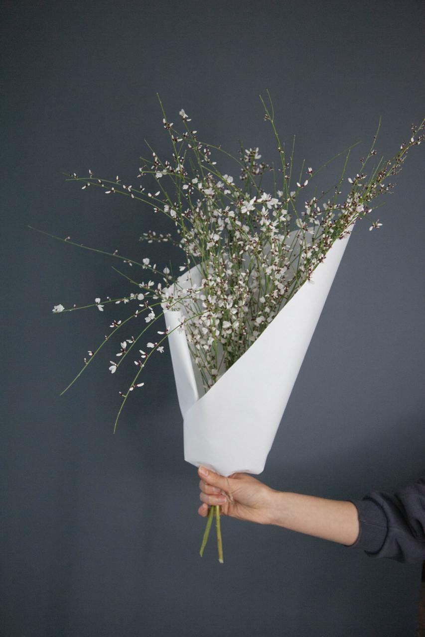 Лёгкие ветви с мелкими цветками создают мягкий, светлый объём.