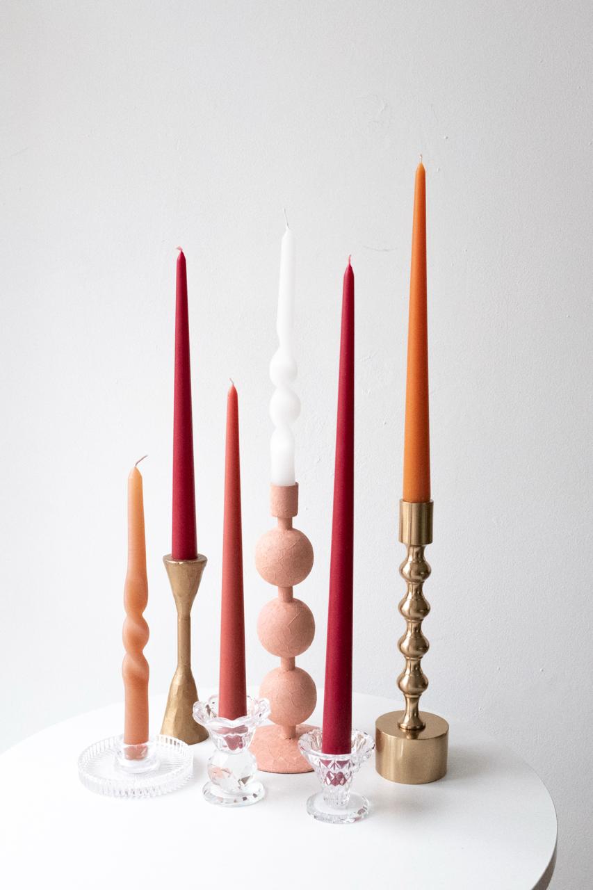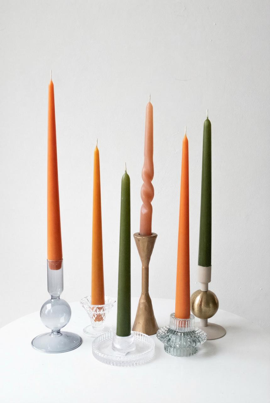 Интерьерный сет из стеклянных и металлических подсвечников с цветными свечами. Набор собран с акцентом на форму, пропорции и сочетание материалов — стекло, металл, воск.
