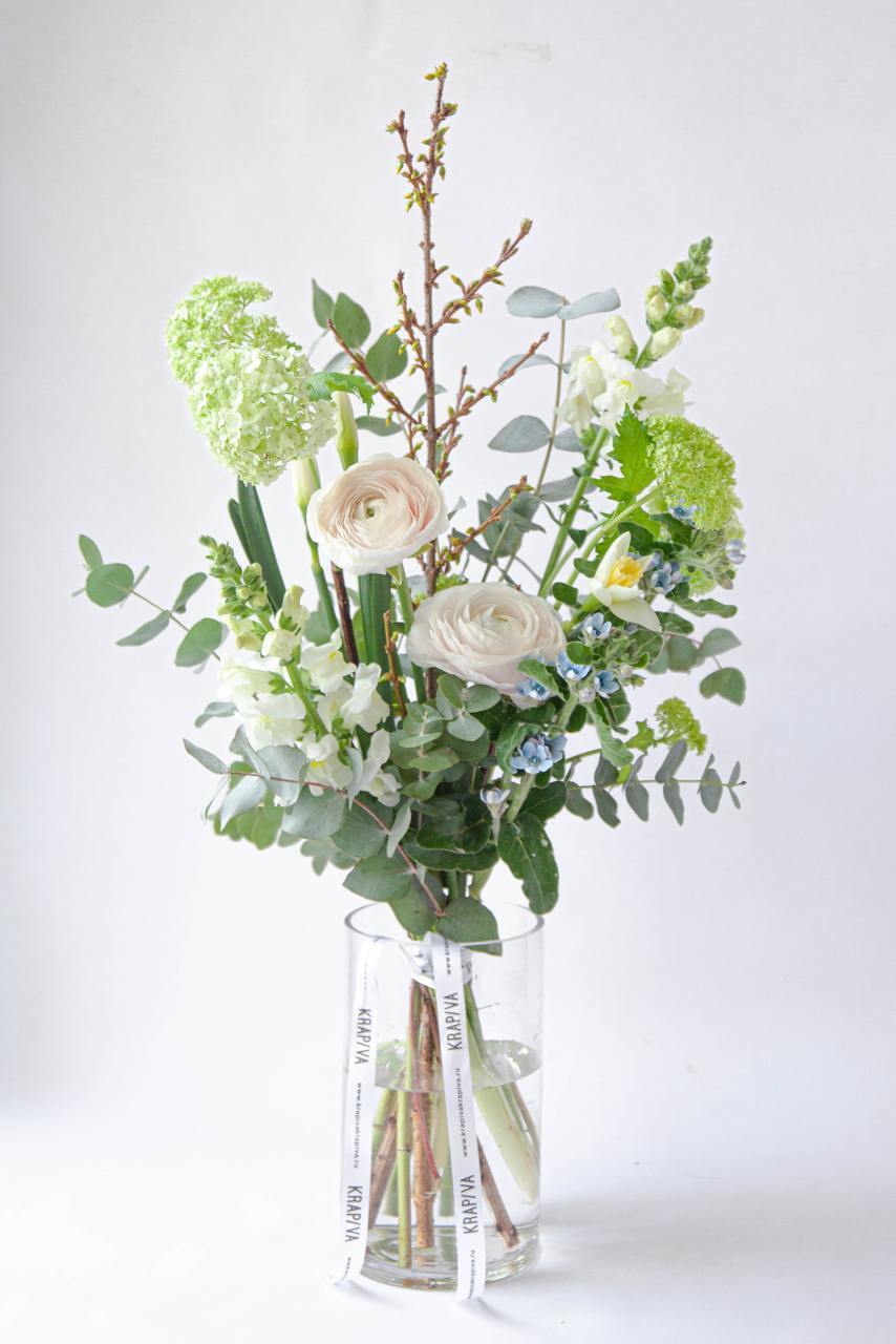 Композиция собрана из сезонных цветов и ветвей, с ощущением сада, воздуха и лёгкой небрежности. В букете есть и раскрытые цветы, и бутоны, поэтому он меняется со временем и остаётся живым, естественным, настоящим.
