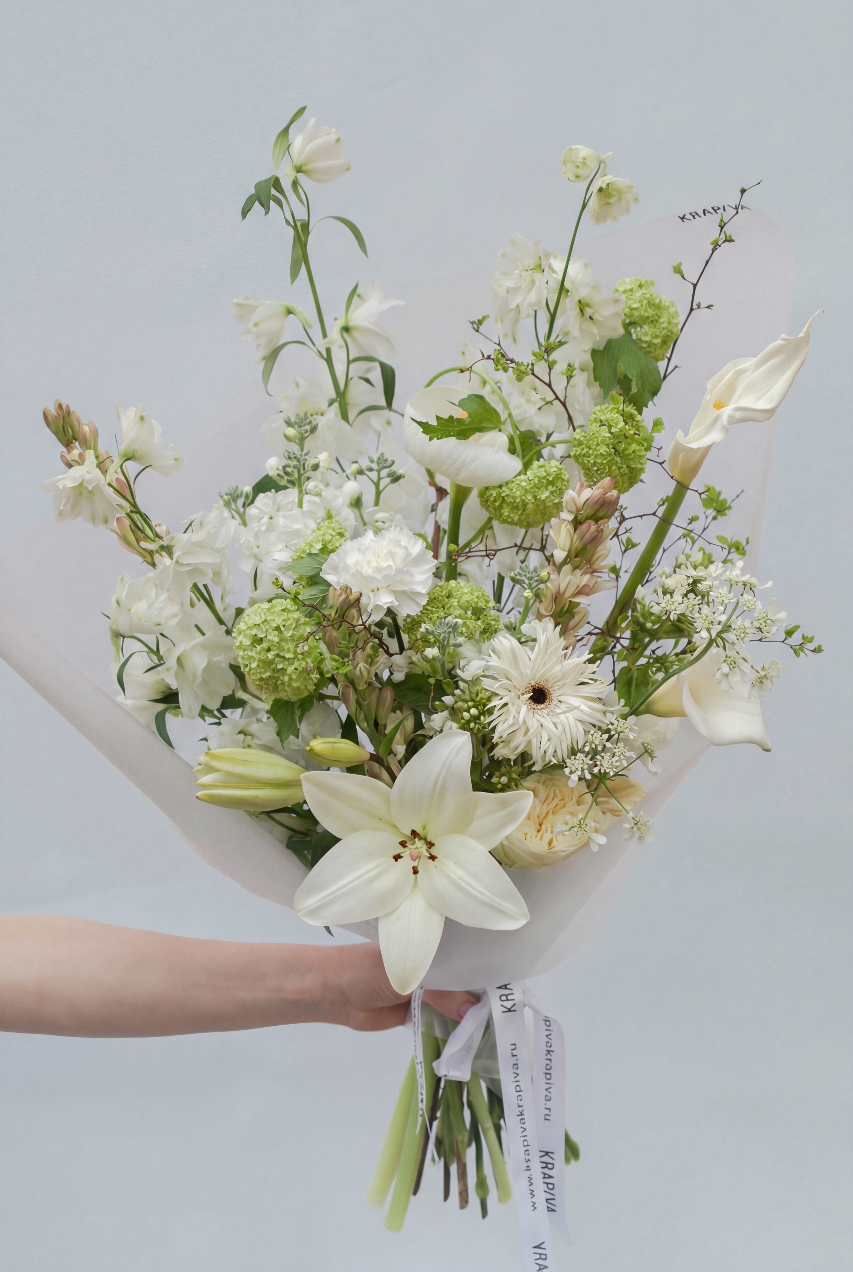 Составе: маттиола, ранункулюс, озотамнус, эвкалипт, дельфиниум.
