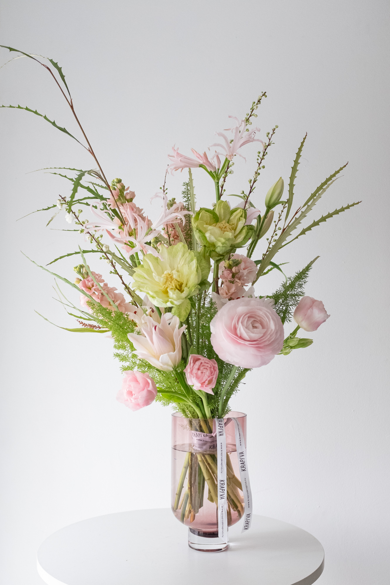 Нежный букет в розово-зелёной гамме с ранункулюсами, тюльпанами, розами и сезонной зеленью. Подходит для подарка, интерьерного акцента и особых случаев. Премиальная флористика KRAP/VA с доставкой по Москве.