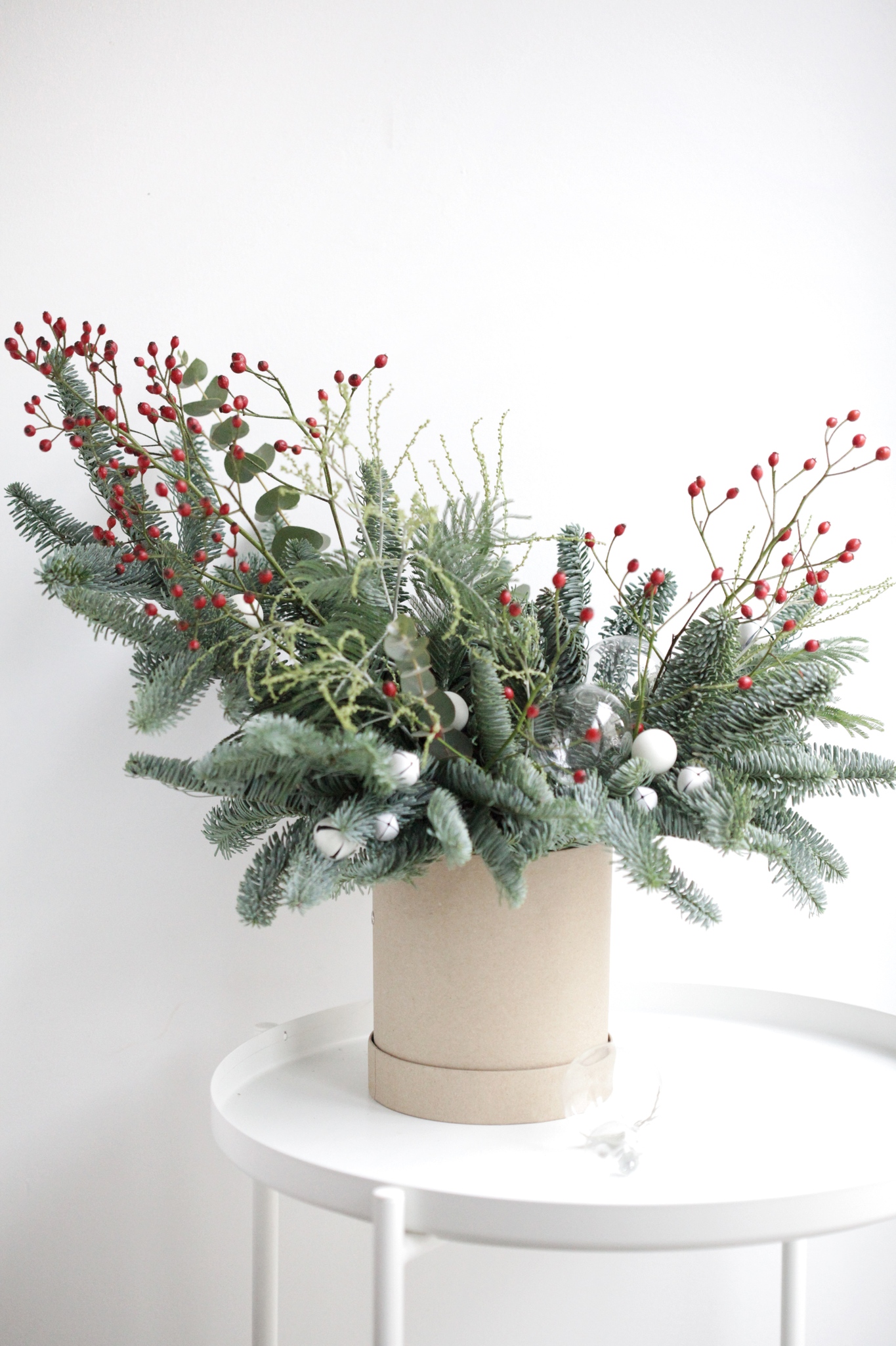 Новогодняя композиция среднего размера. Высота вместе с коробкой 20 см.