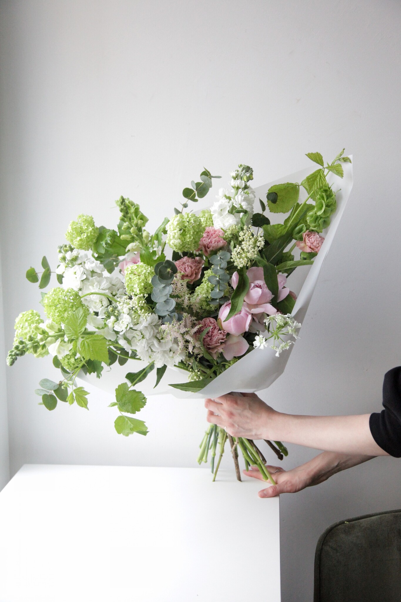 В составе: Молюцелла, Малина, Пионы, Гвоздики, Сирень, Эвкалипт, Нарциссы, Аллиум, Орлая вайт пинч, Лютики, Антиринум.