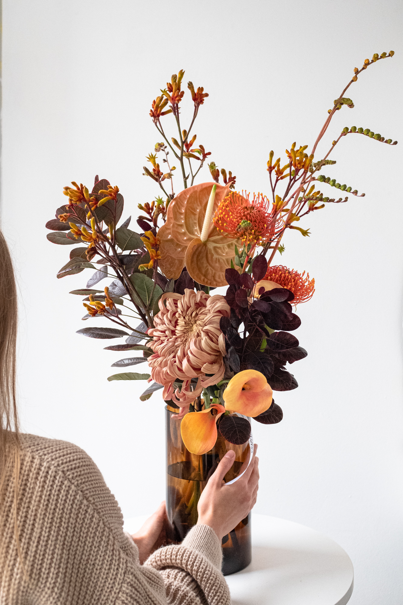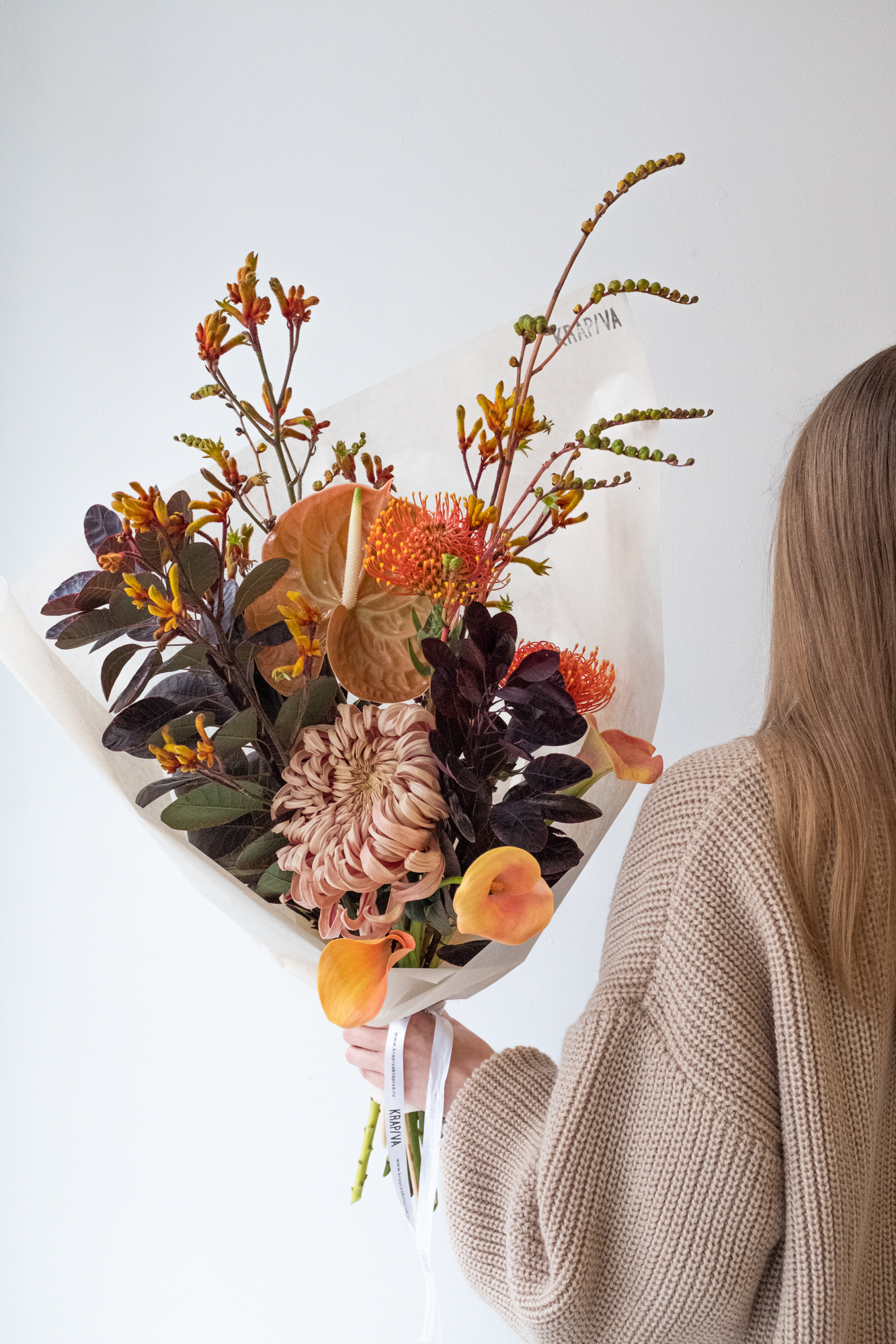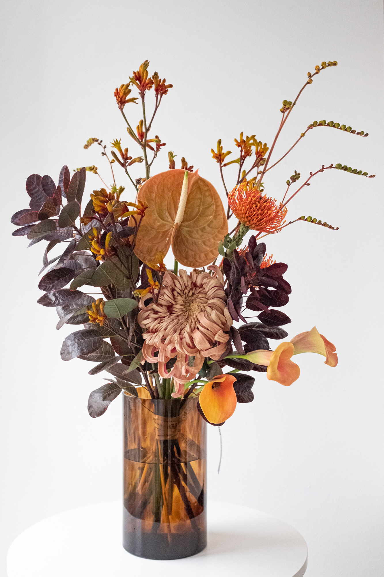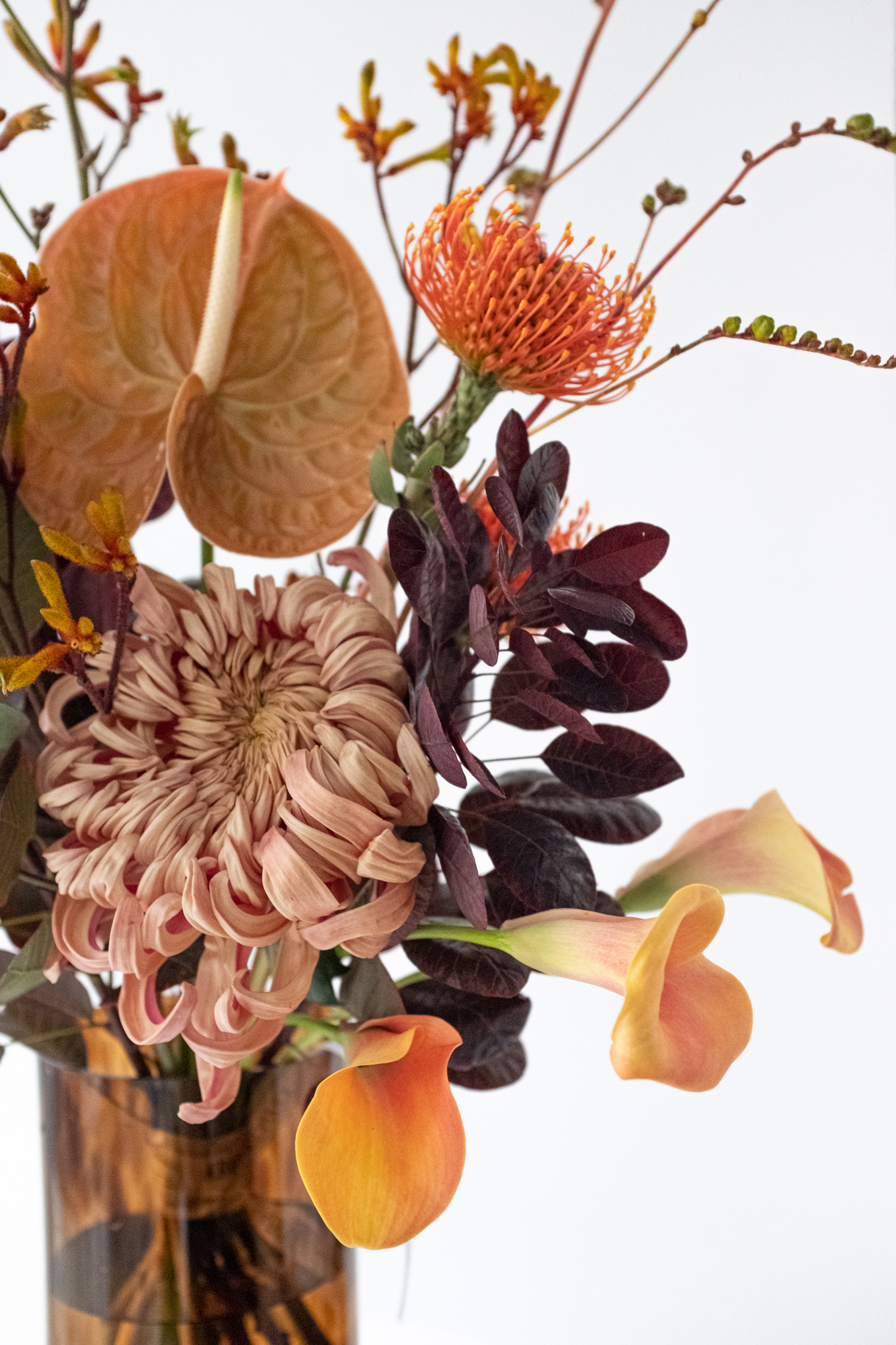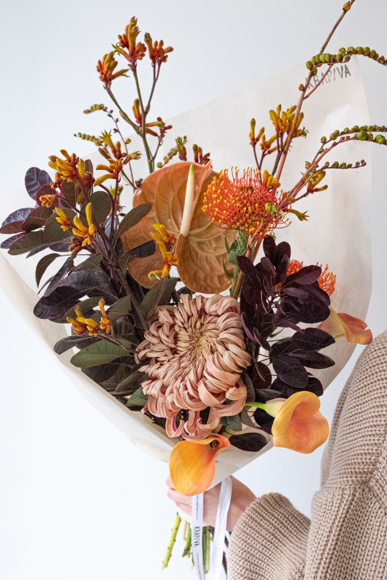 Антуриум, калла, нутан и хризантема в осенней палитре — и немного дикости в виде анигозантуса и тёмной листвы.