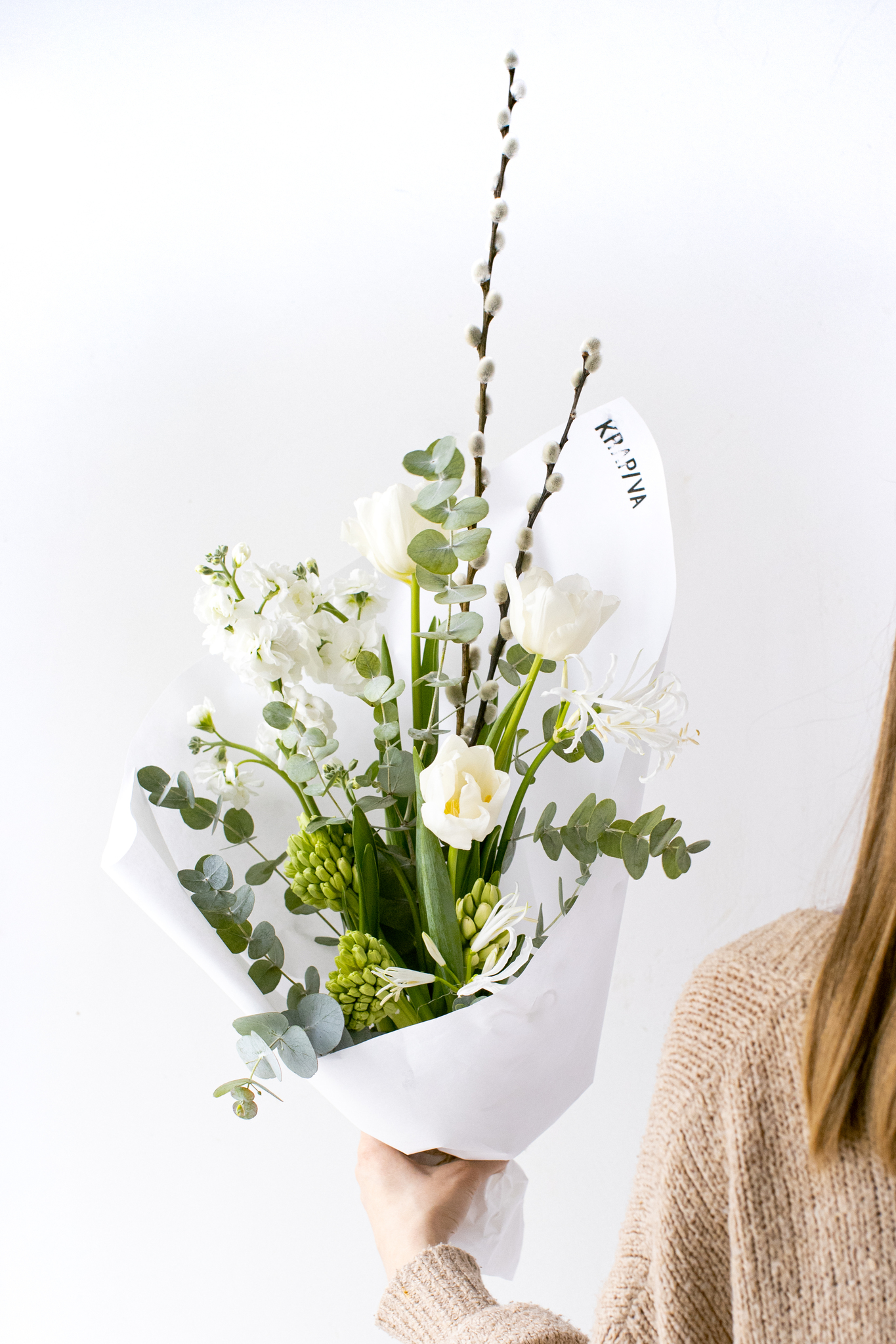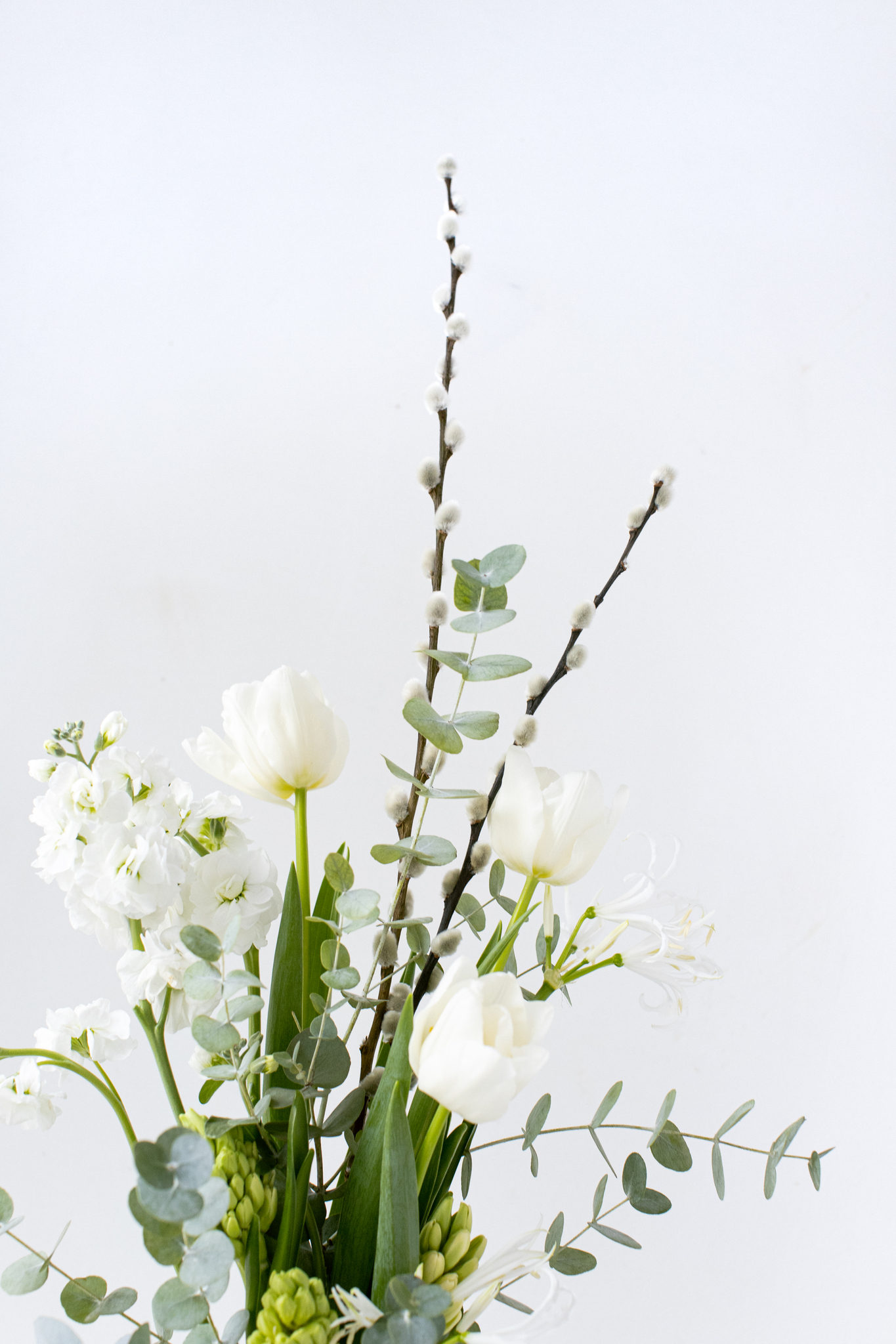 В составе: тюльпан, гиацинт, маттиола, нерине, маттиола, верба, эвкалипт.