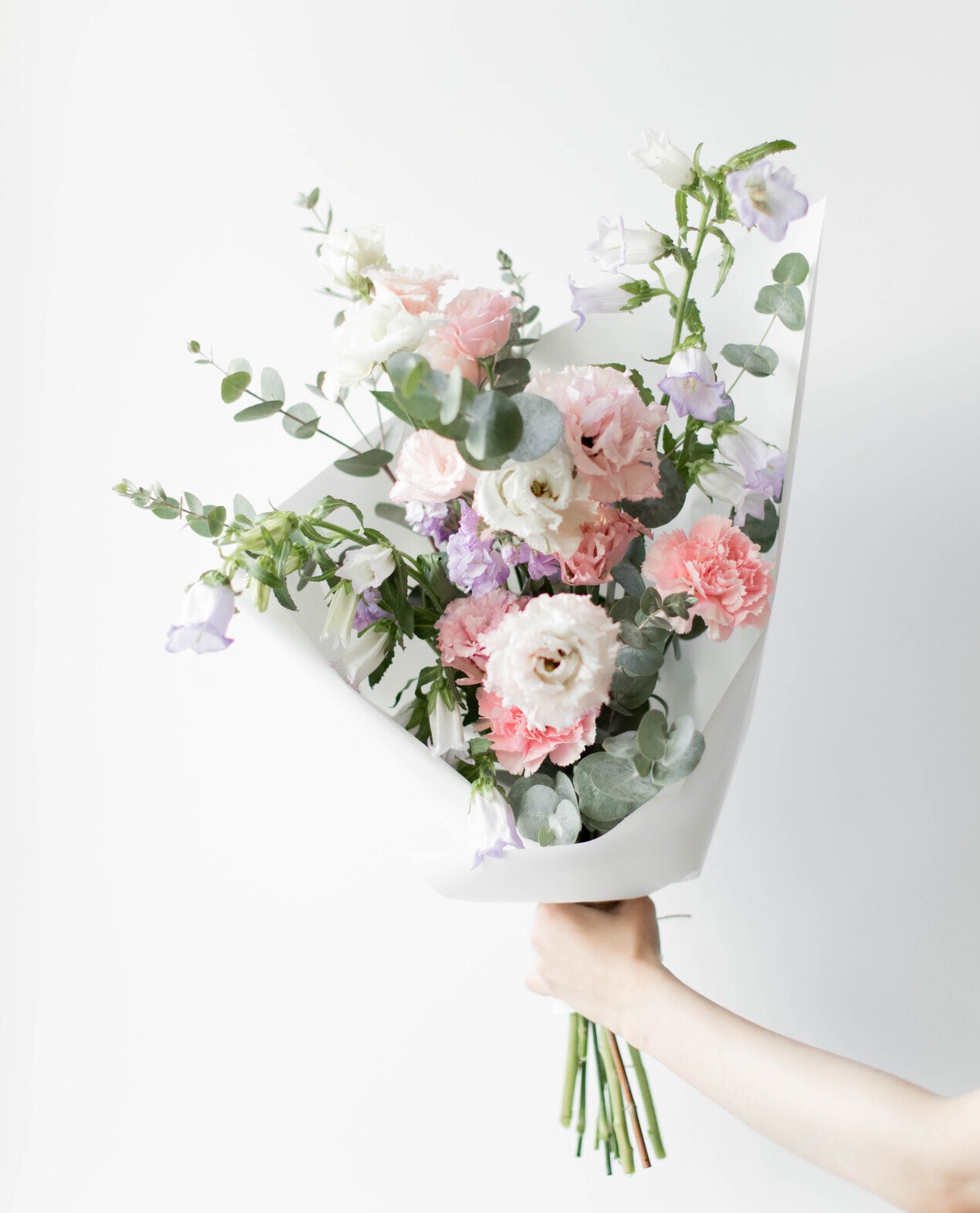 Состав: хризантема, маттиола, хамелациум, гербера, ранункулюс, эустома, нерине, гвоздика, эвкалипт