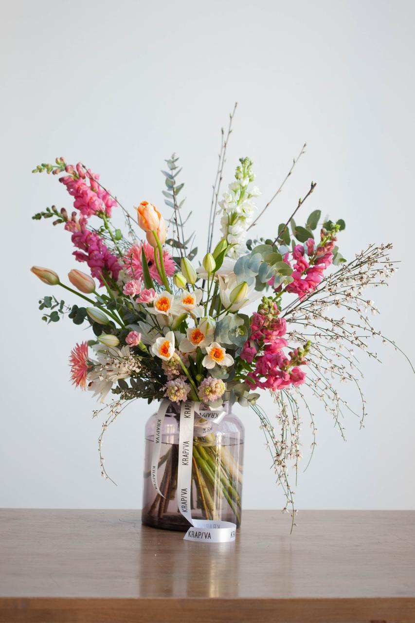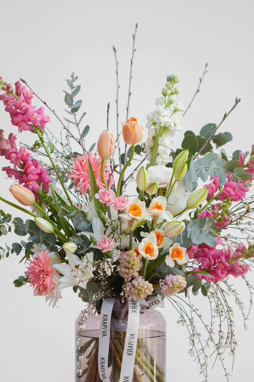 В составе: Ранункулюс, лилия, нарцисс, антирринум, гиацинт, гербера, маттиола, тюльпан, гвоздика, гениста, эвкалипт, вишня.