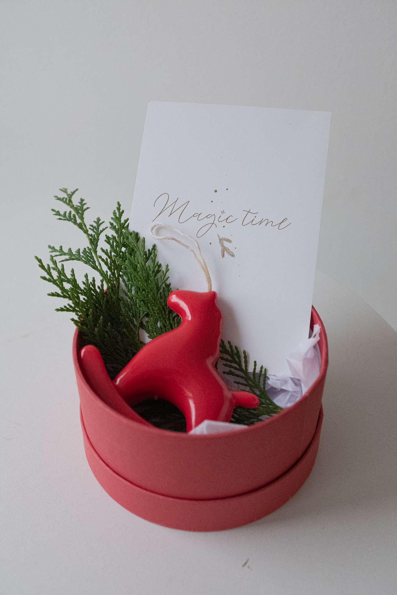 Свеча выполнена из качественного воска, аккуратно отлита и приятна на ощупь. Её можно зажечь в тихий вечер или оставить как декор в виде символа года. Внутри коробки — еловая веточка и открытка, на которой можно оставить несколько слов или просто сохранить её как часть композиции.