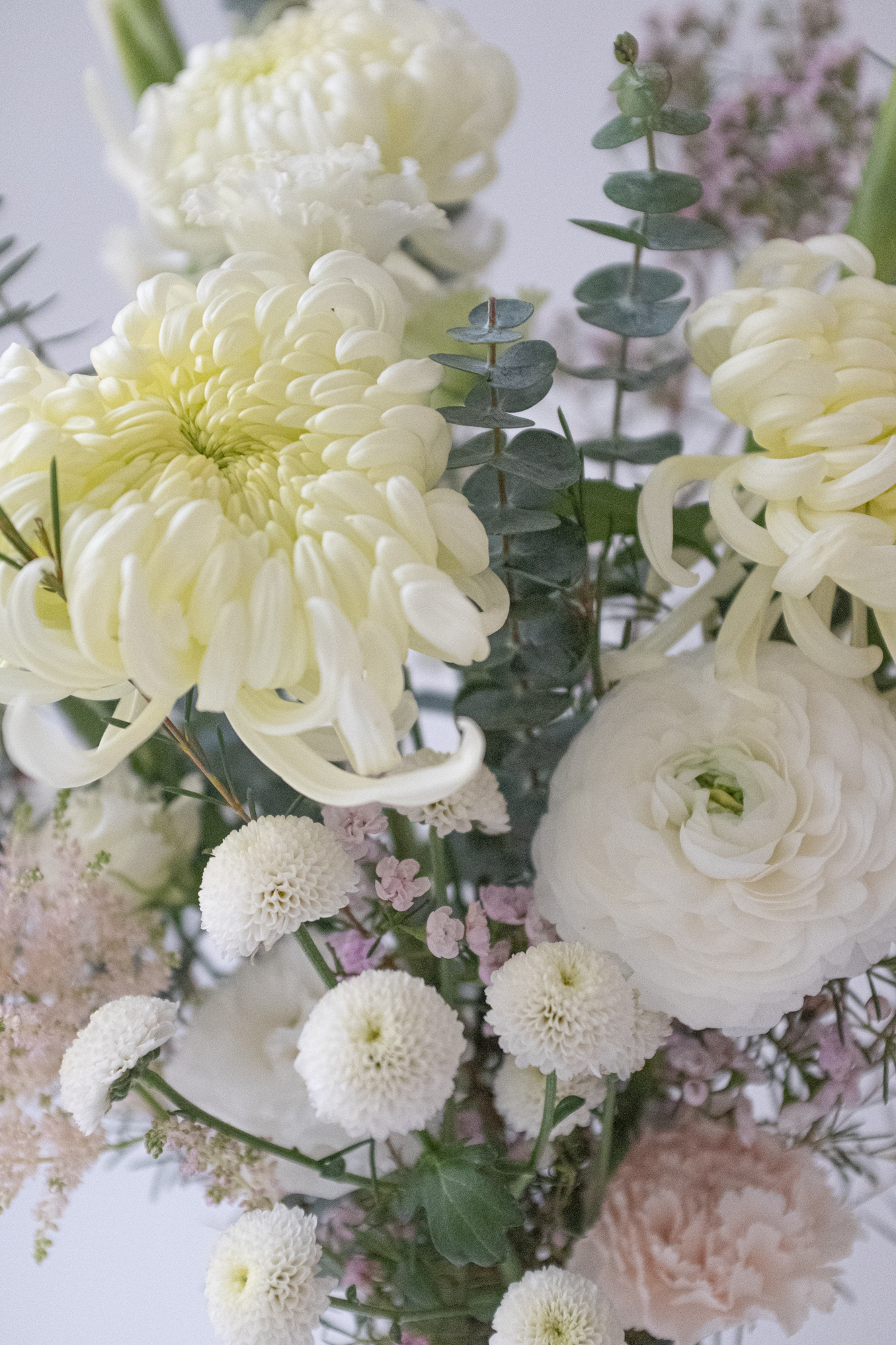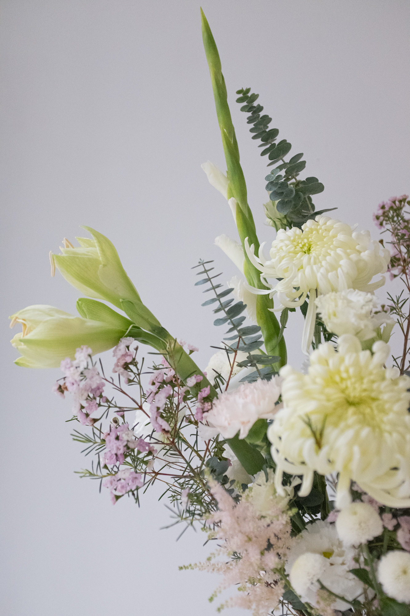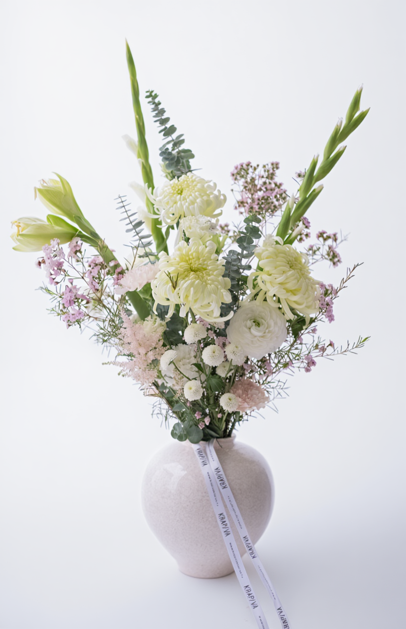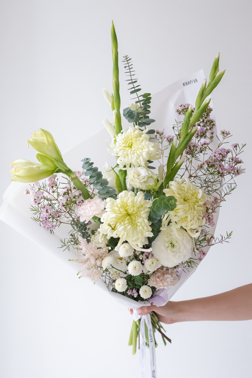 Состав: хамелациум, ранункулюс, амариллис, хризантема, гвоздика, гладиолус, астильба, эвкалипт