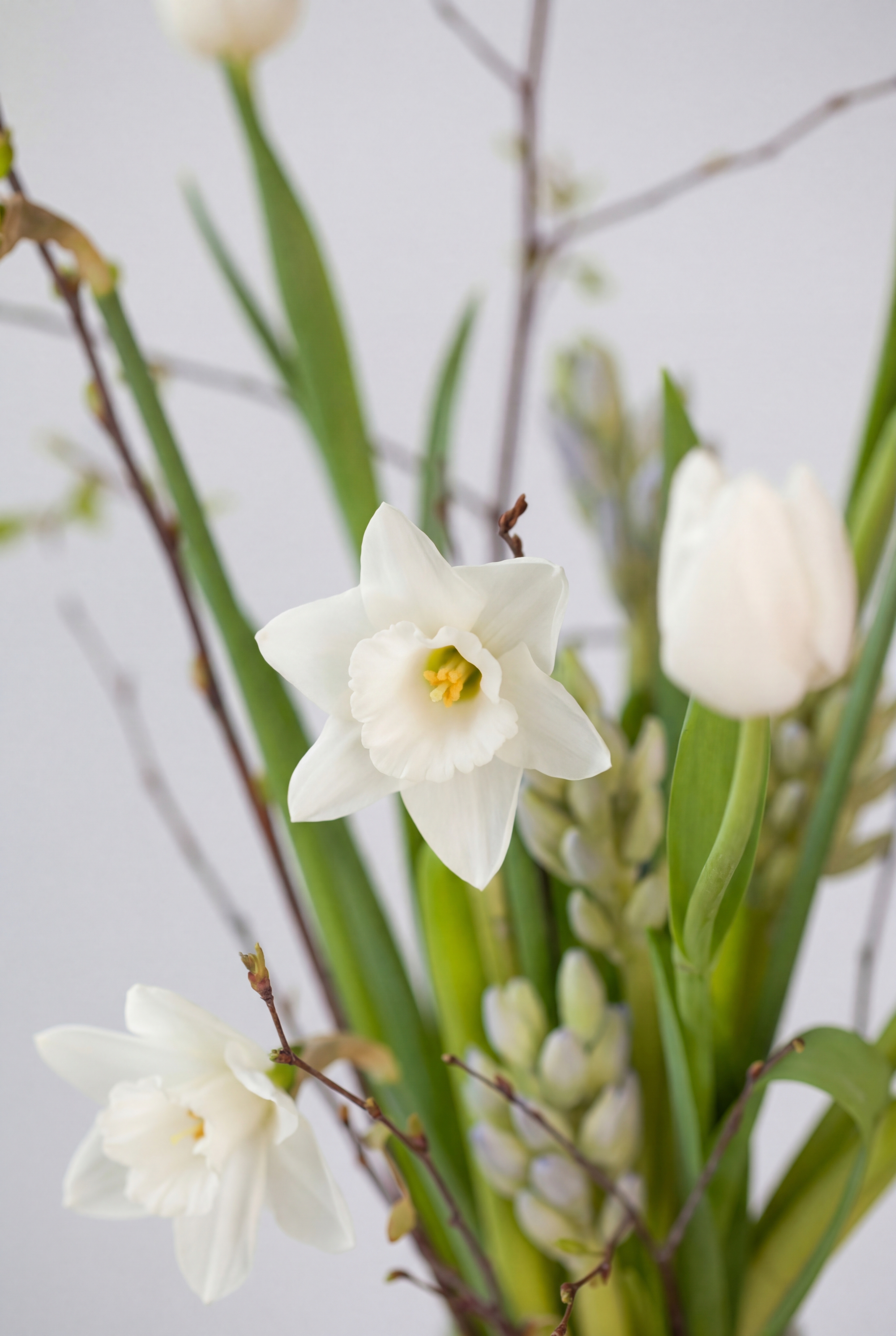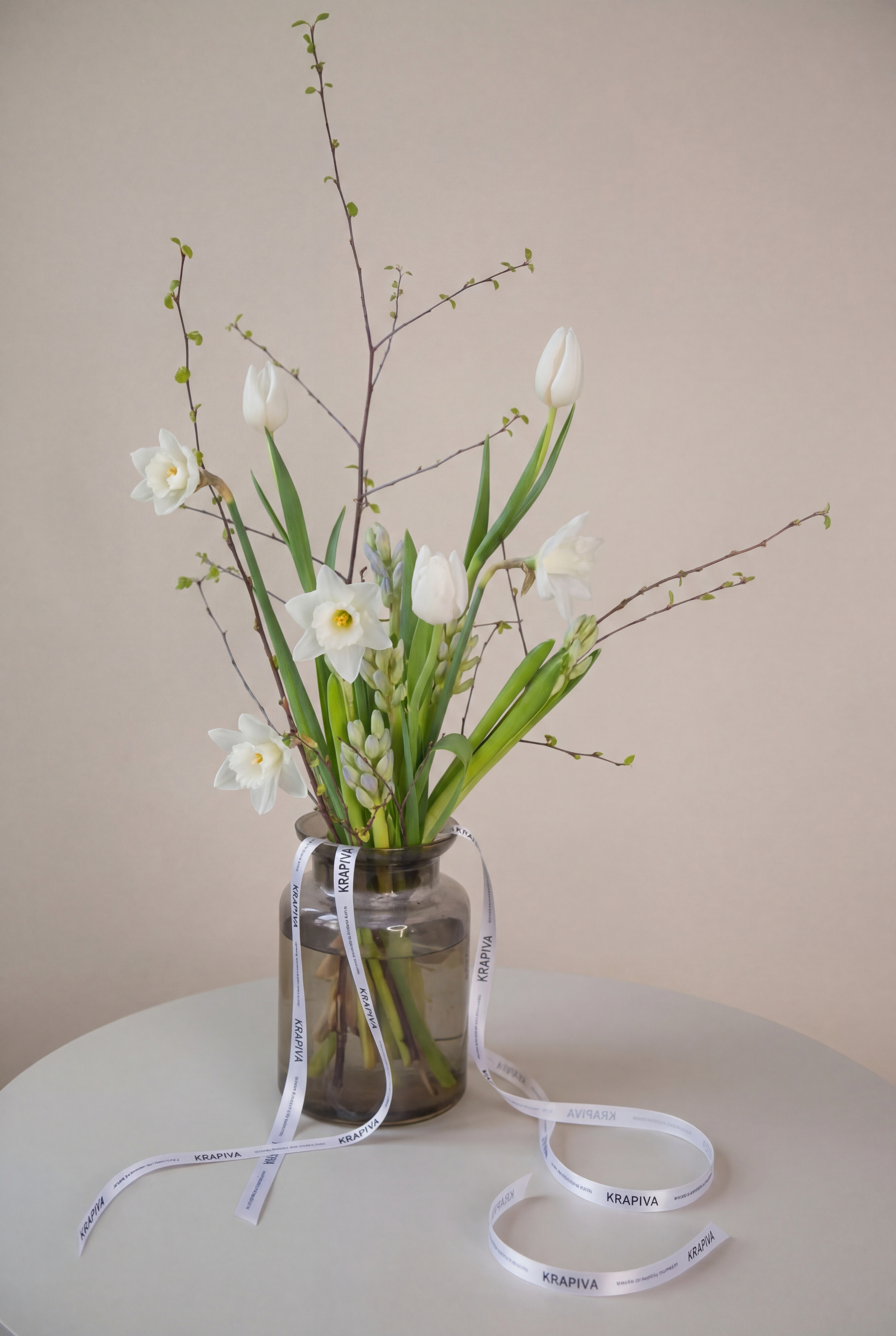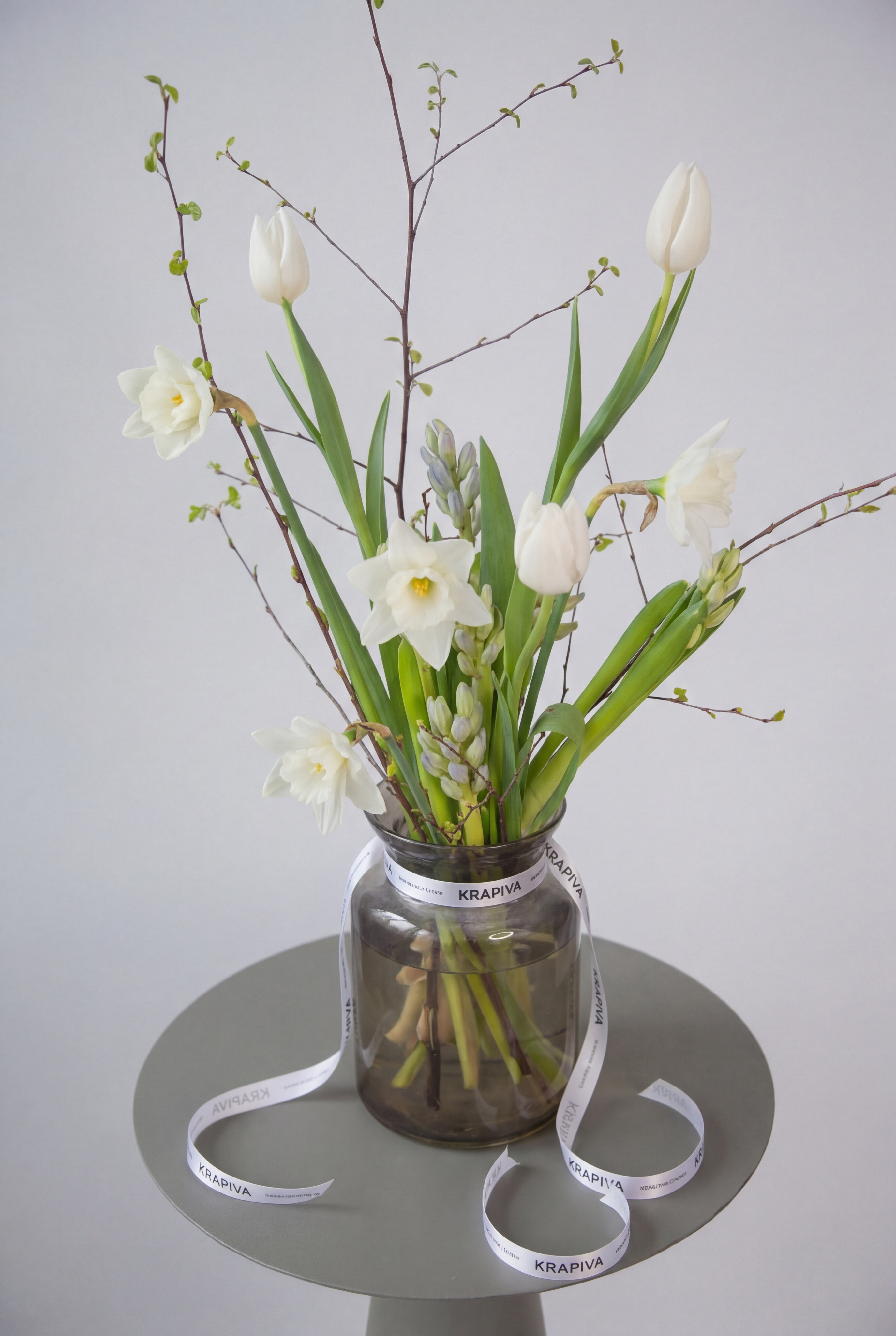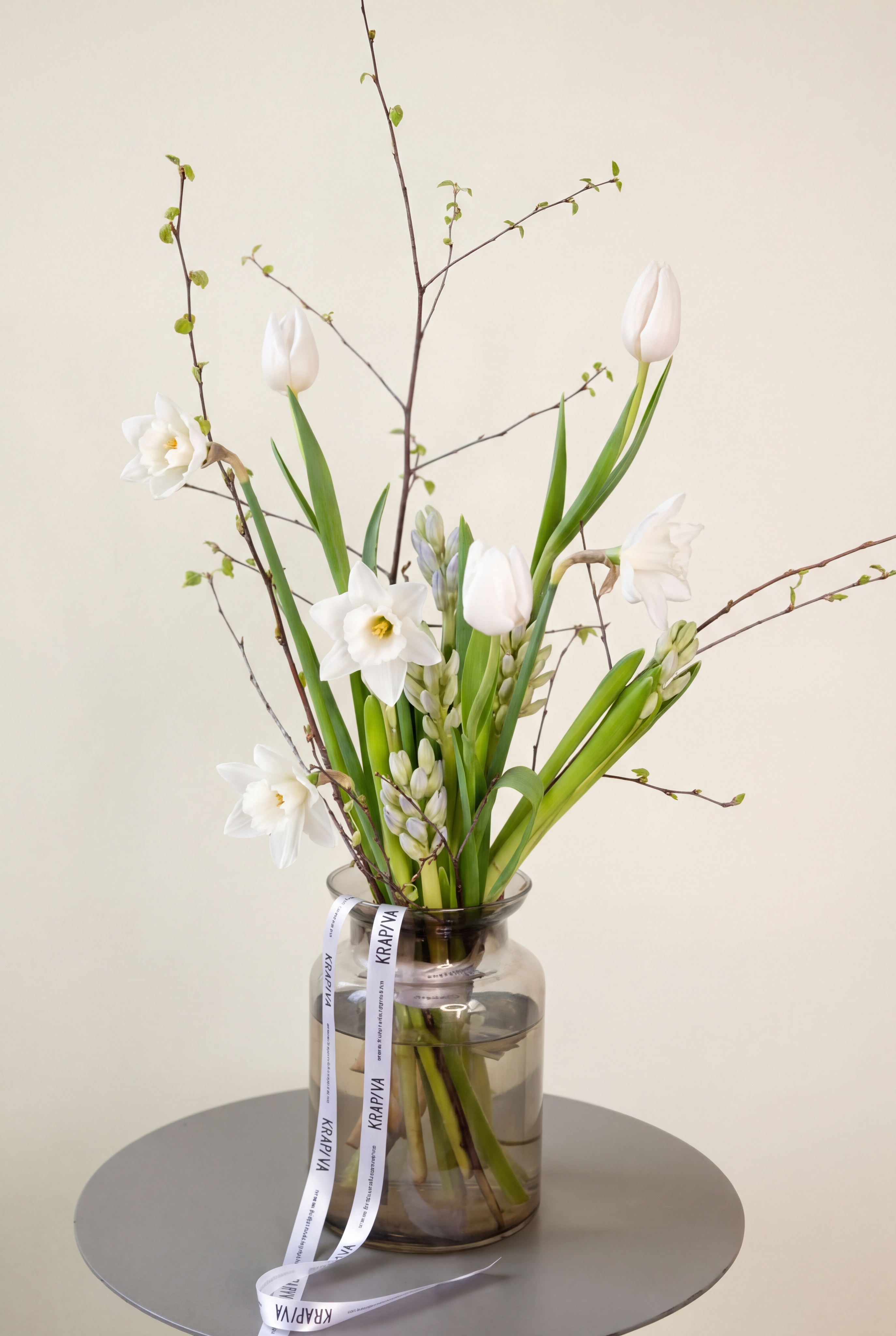 В составе:  Тюльпан, маттиола, орхидея ашима, гениста.