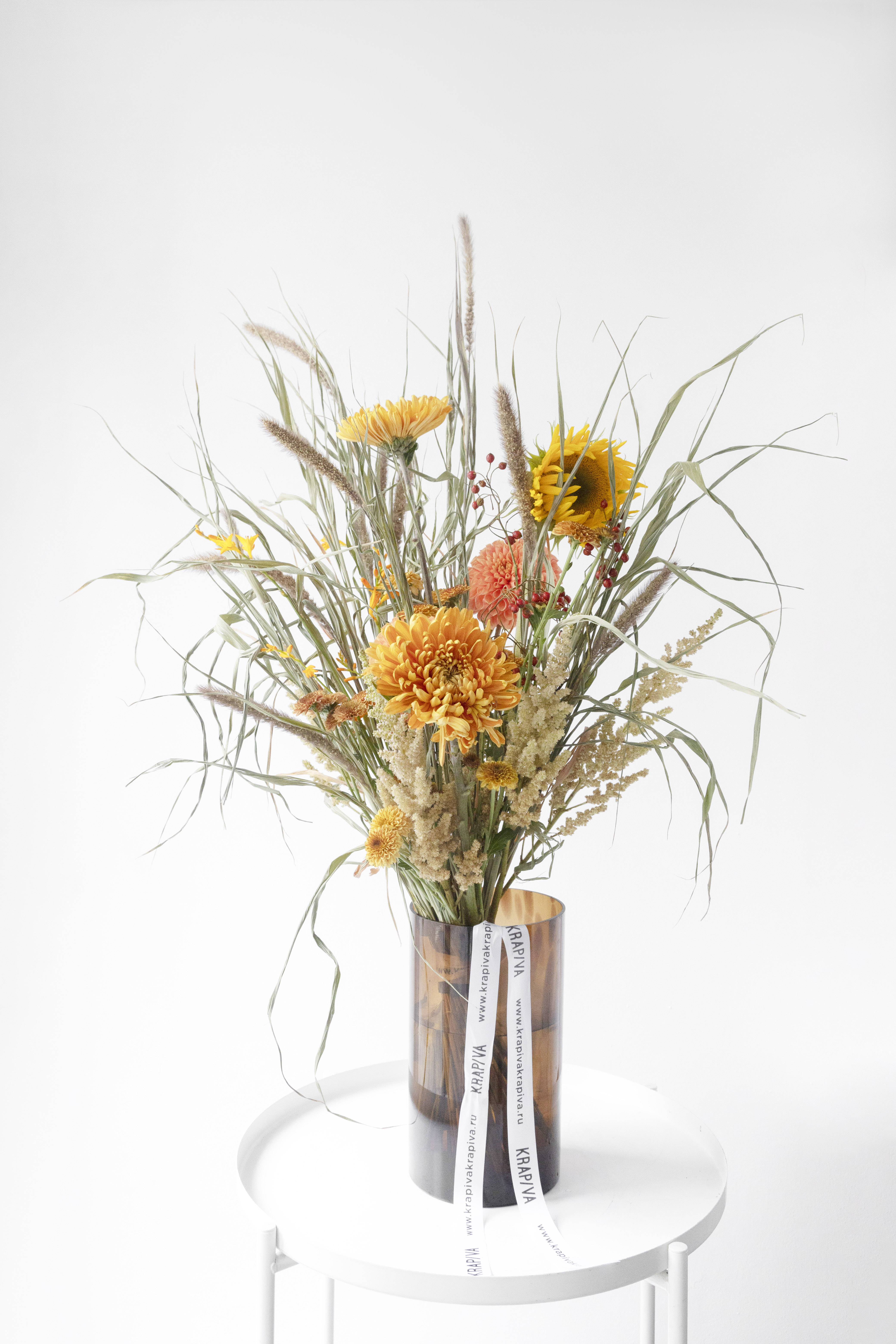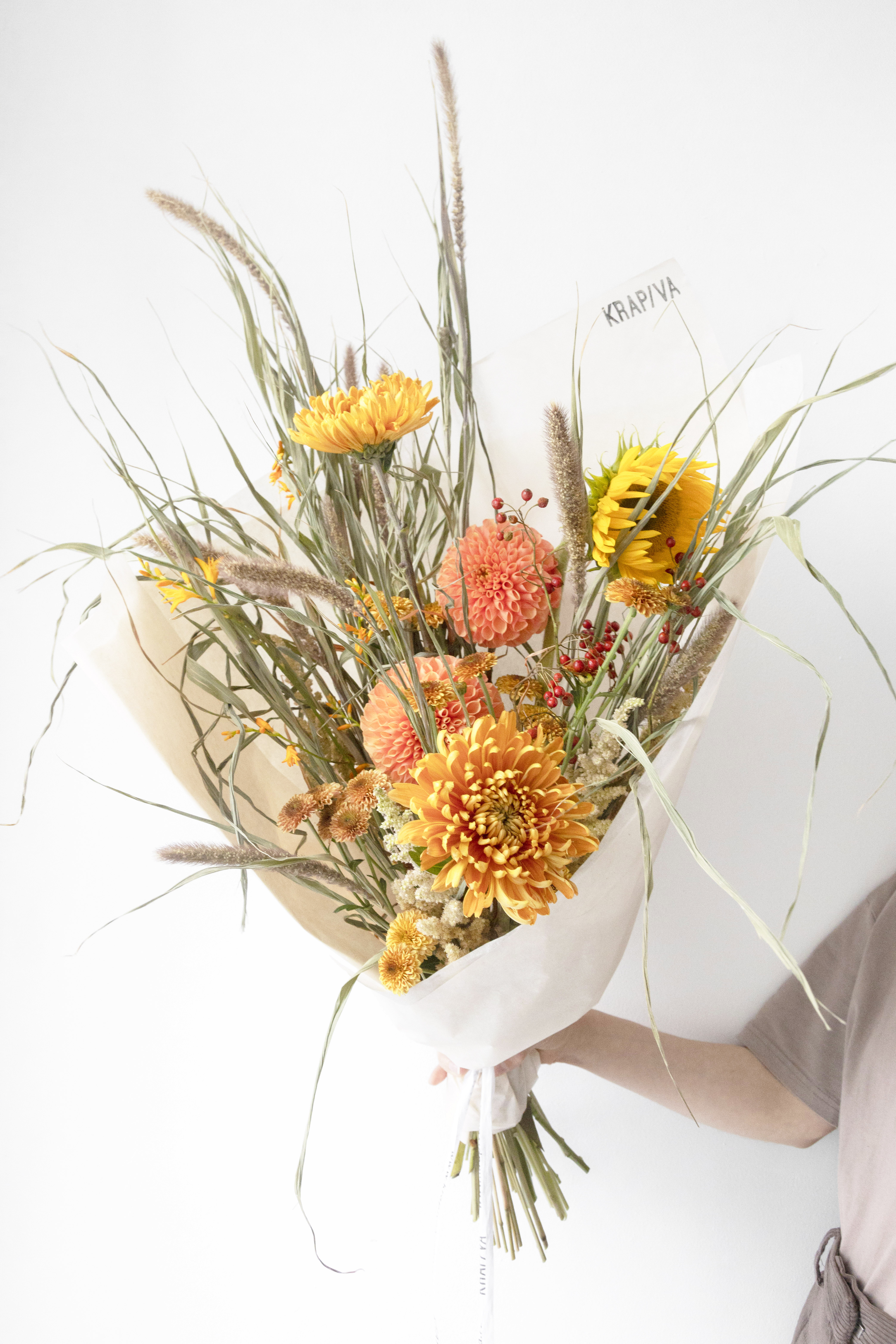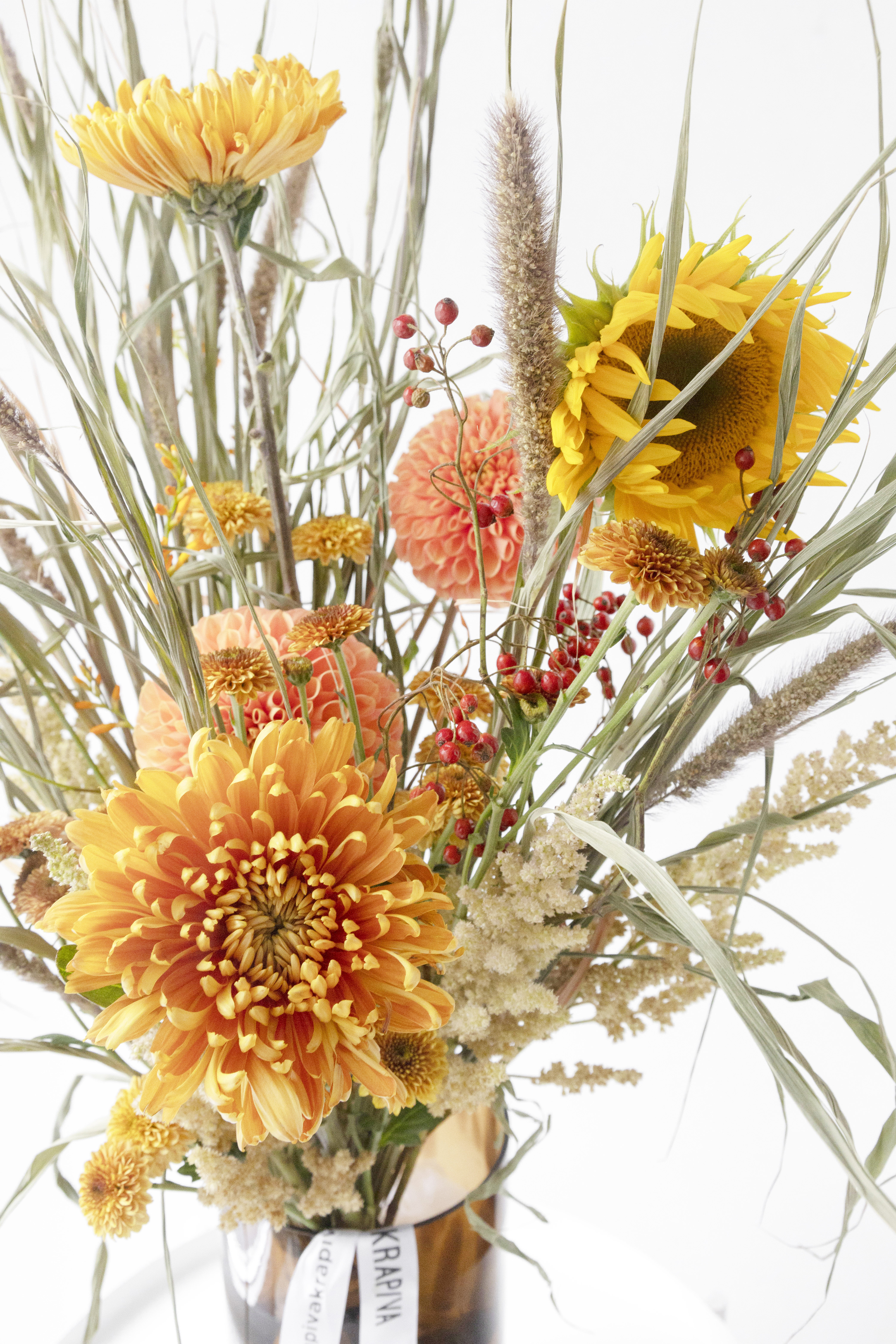 Купить букет с хризантемами, подсолнухами и шиповником в натуральной теплой гамме. Авторская флористическая композиция с крокосмией, сетарией и астильбой. Идеальный букет в подарок женщине или мужчине, для интерьера или на особый случай. Закажите доставку букета «Ветивер и шиповник» — флористическая формула заземлённости и спокойствия.