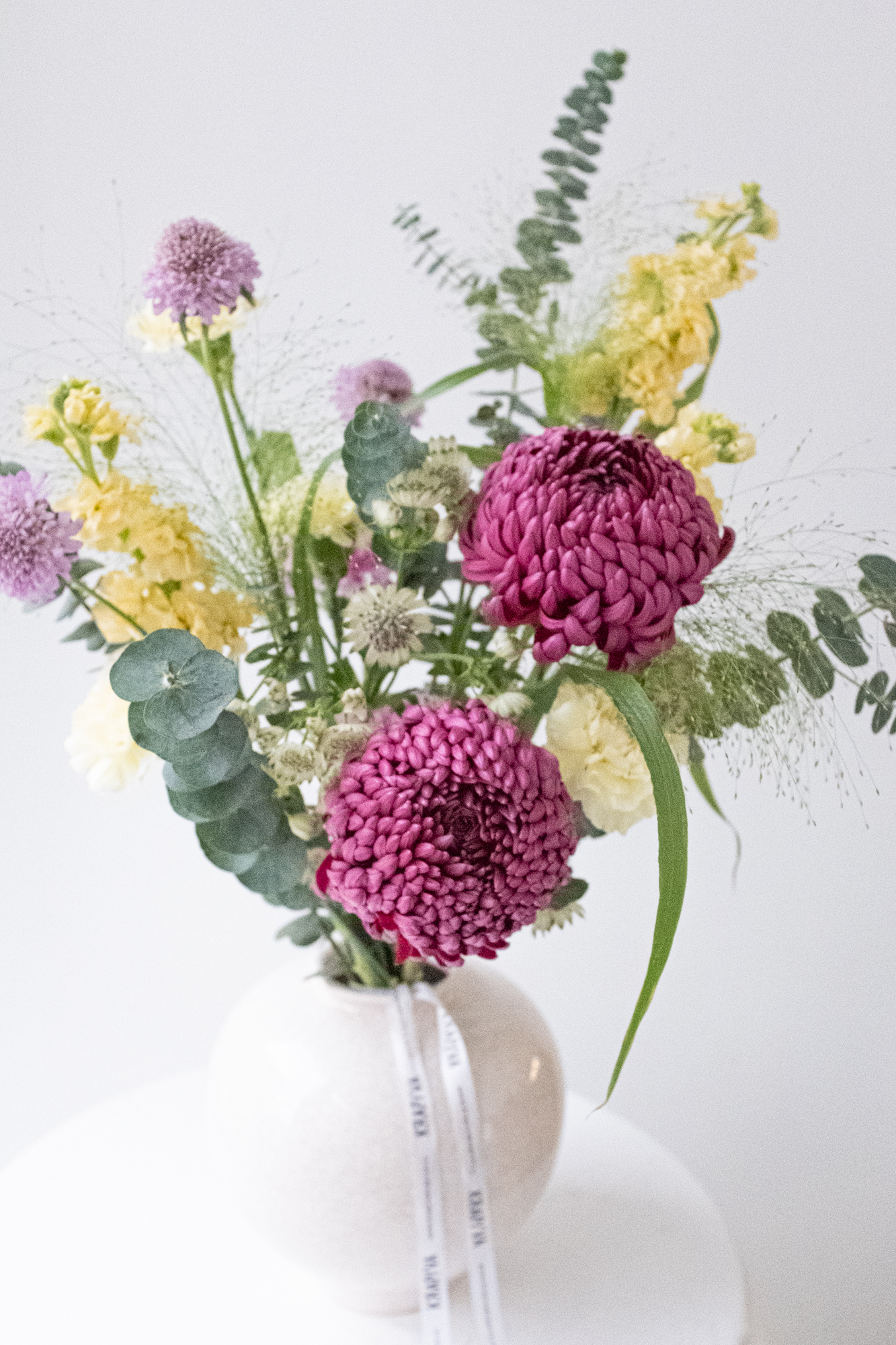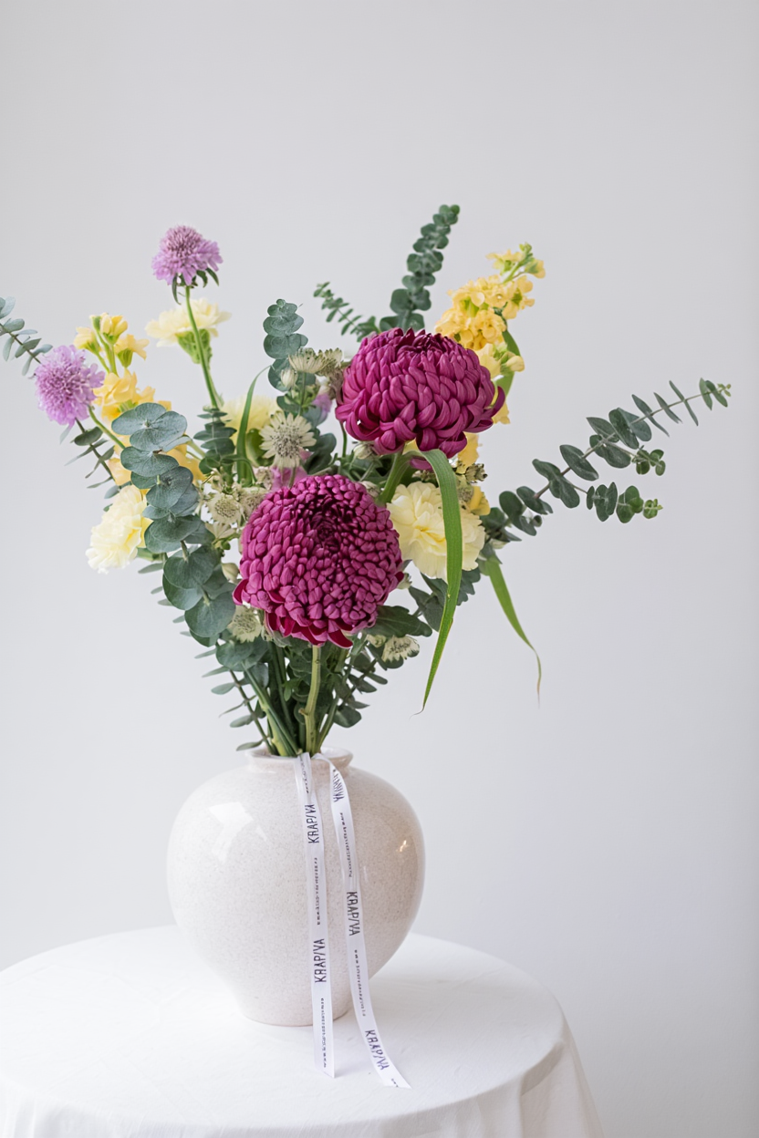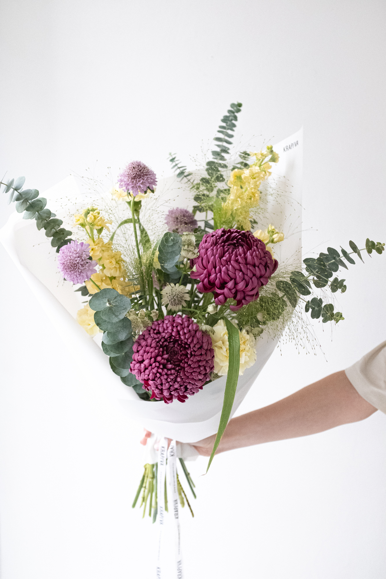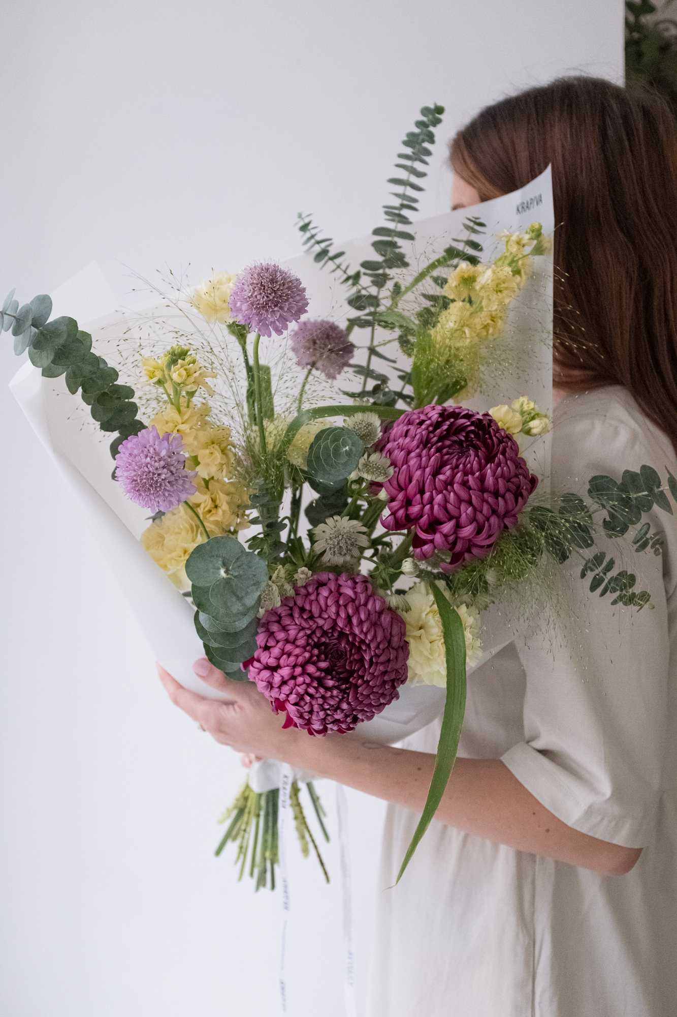 Состав: хризантема, маттиола, паникум, гвоздика, астранция, скабиоза, эвкалипт