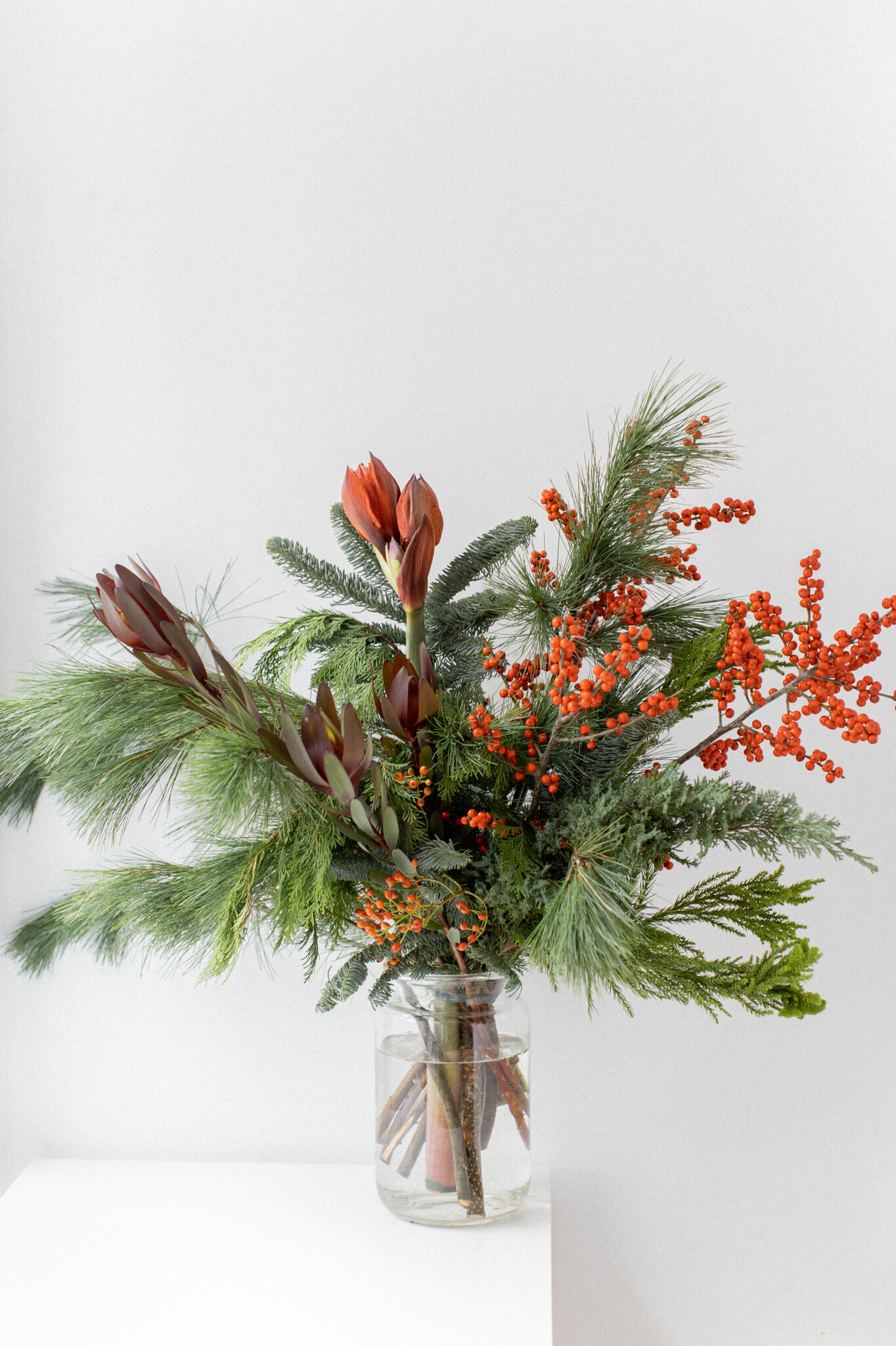 Яркий интерьерный букет со стойким составом. Праздничные ягоды илекса, экзотический леукодендрон и красный амариллис, за раскрытием которого хочется наблюдать.